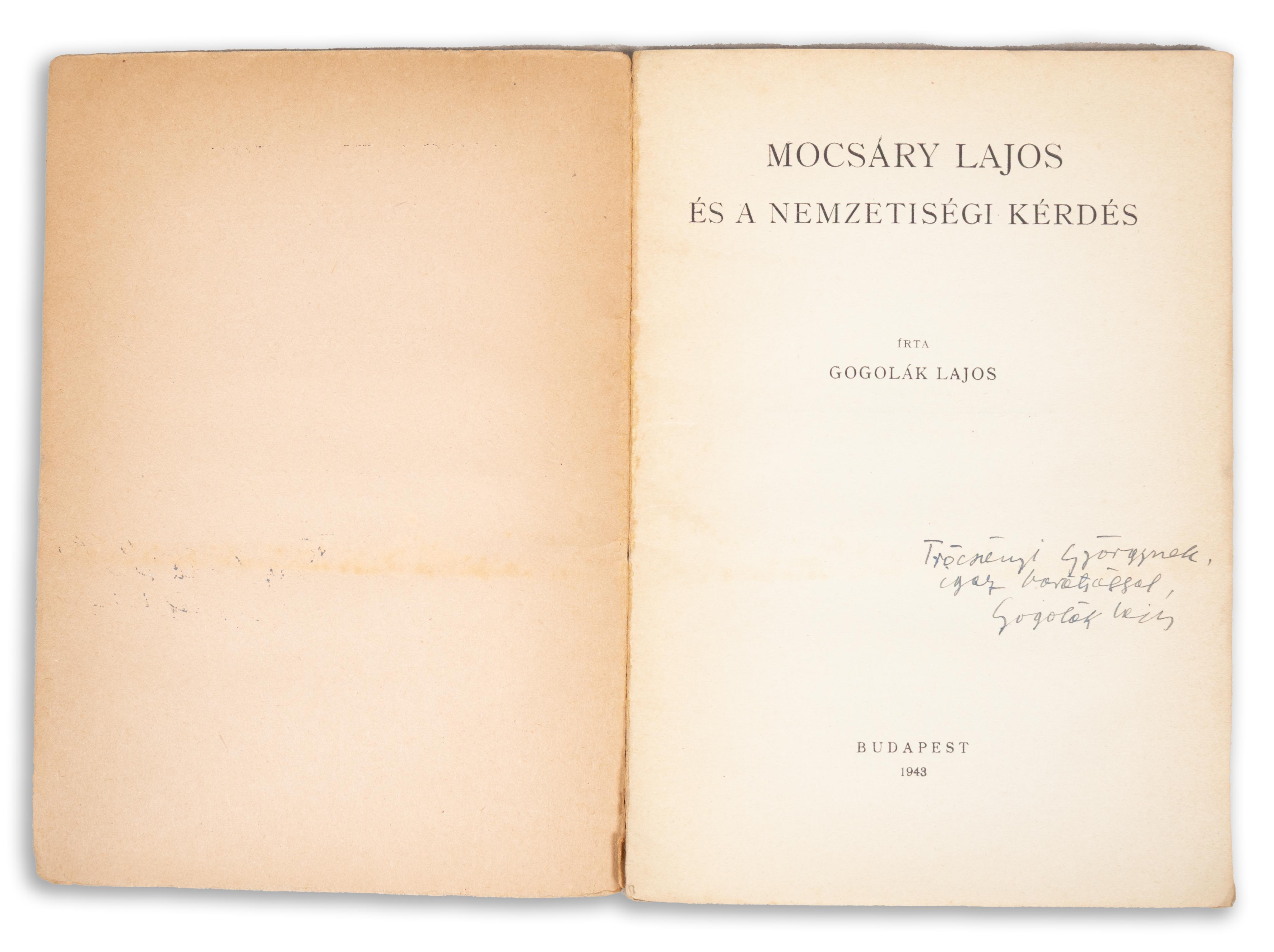 A címlapon a szerző Trócsányi Györgynek szóló dedikációja.