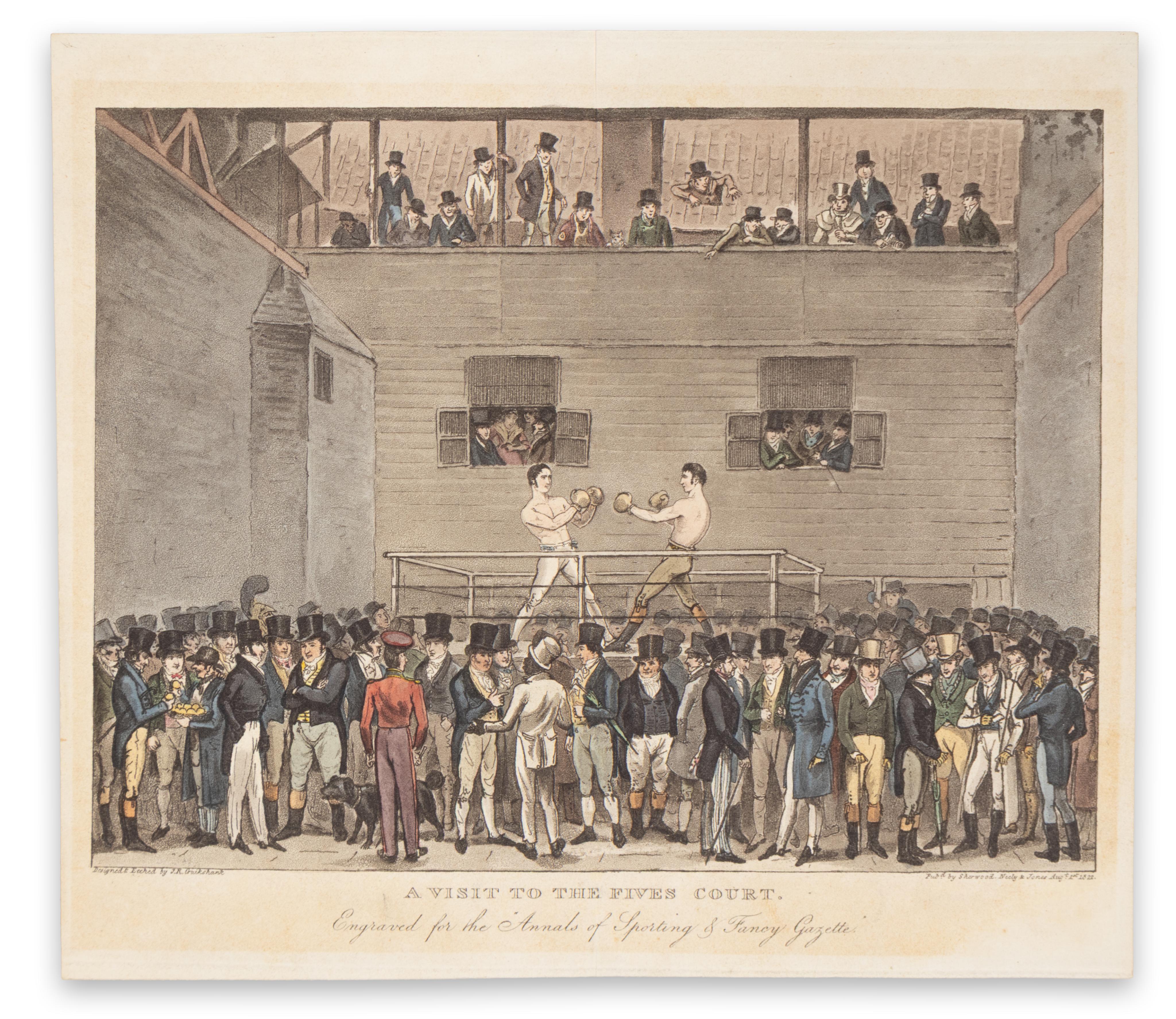 London, Sherwood, Neely & Jones, 1822A boksz meccset ábrázoló metszet az Annals of Sporting and Fancy Gazette 1822 augusztusi, nyolcadik számának borítóján jelent meg. (II. kötet, 8. szám.). Alkotója Isaac Robert Cruikshank (1789–1856), karikaturista, illusztrátor és portréminiatűrista. Az Annales of Sporting and Fancy Gazette havi megjelenésű londoni sportmagazin volt, 1822 januárjától 1828 júniusáig, Jonathan Badcock szerkesztésében. Valójában két magazin volt egyben: az Annals of Sporting és a Fancy Gazette, melyet szinte teljes egészében a boksznak szenteltek.