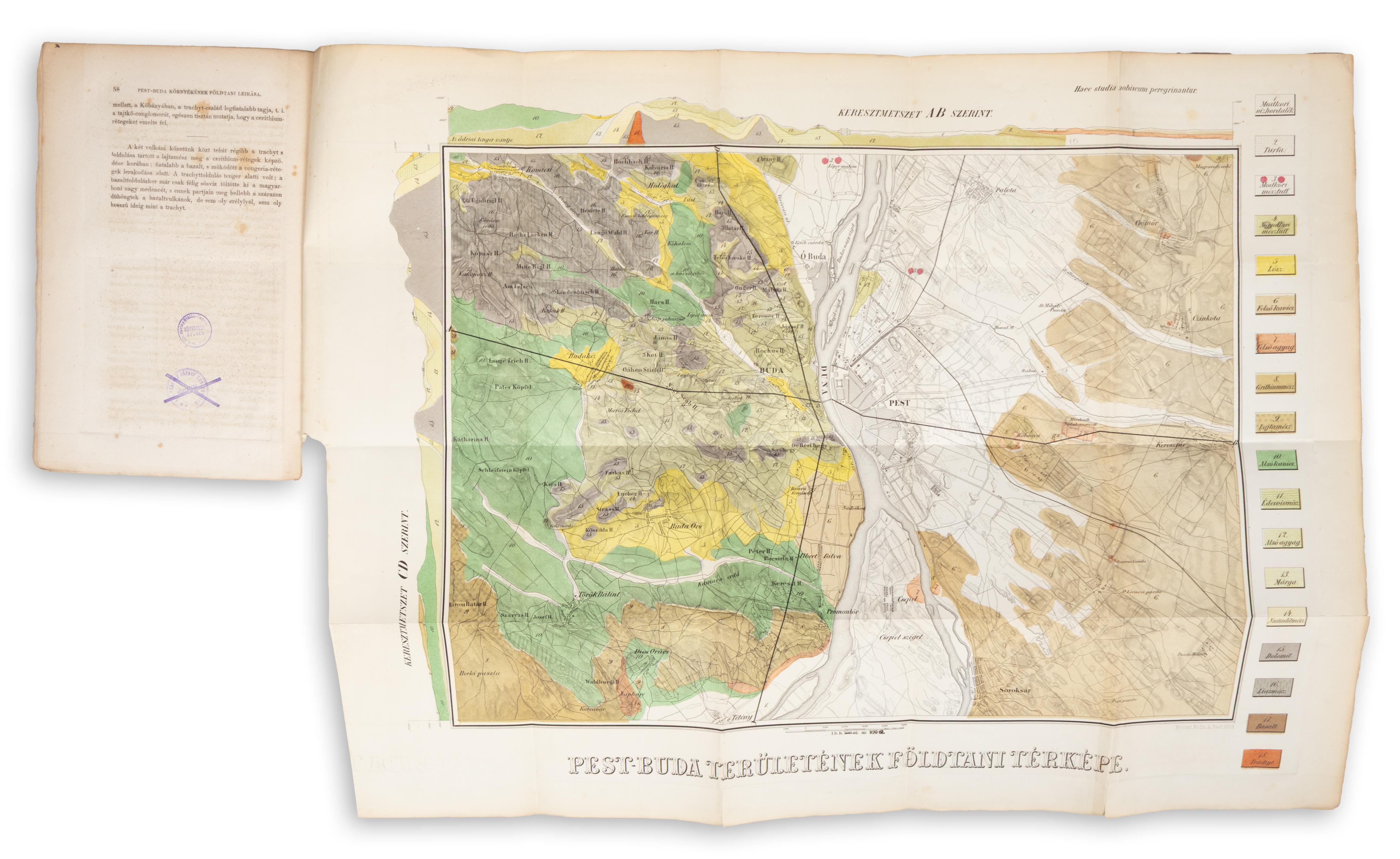 Geological description of the Pest-Buda area. With a lithographed, color geological map. Published in paperback, with uncut pages.