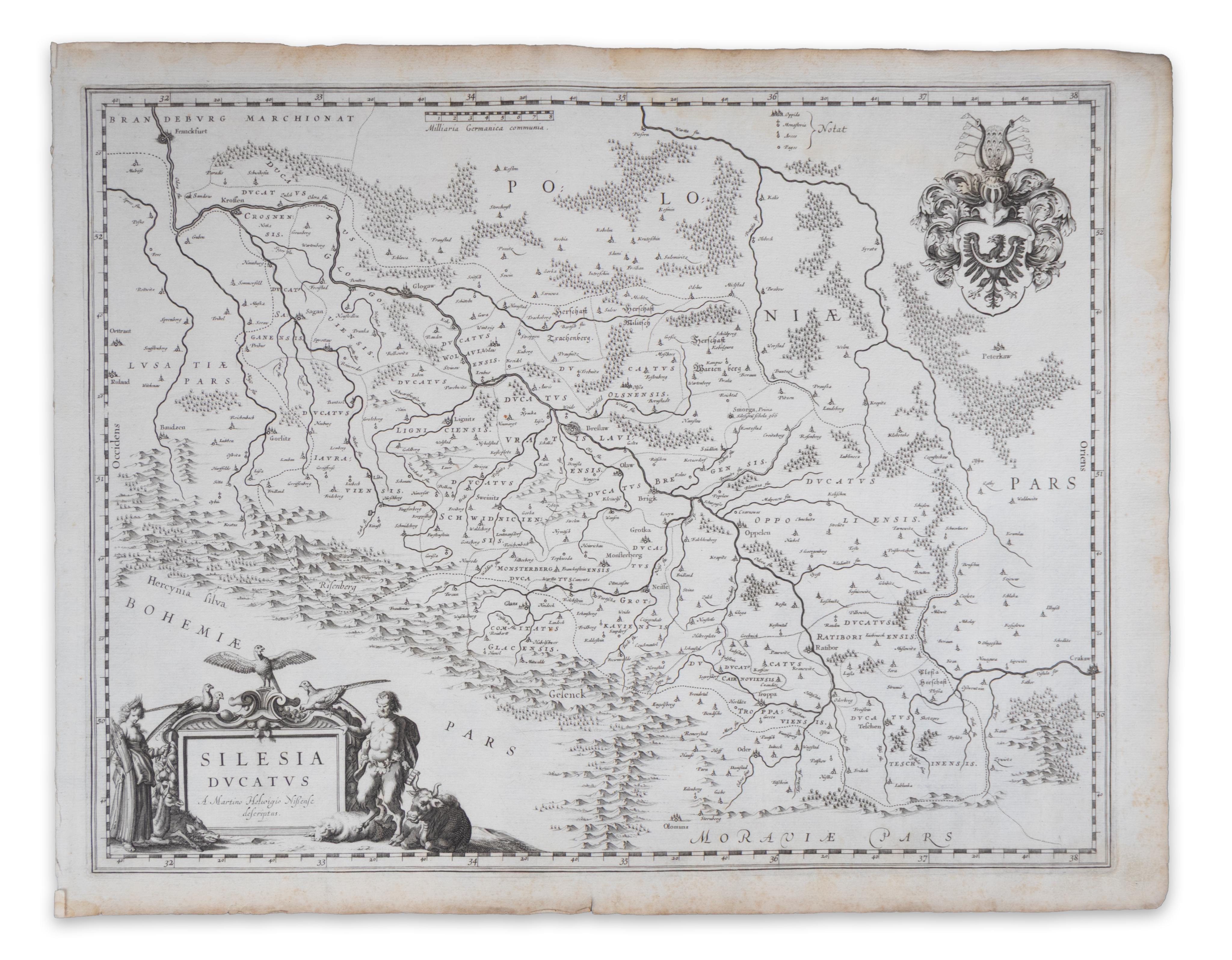 Attractive map of Silesia (Poland) after Martin Helwig with Breslau (Wroclaw) in the center. Allegorical catrouche and coat of arms. First published in Blaeu's Atlas Theatrum Orbis Terrarum in 1634.