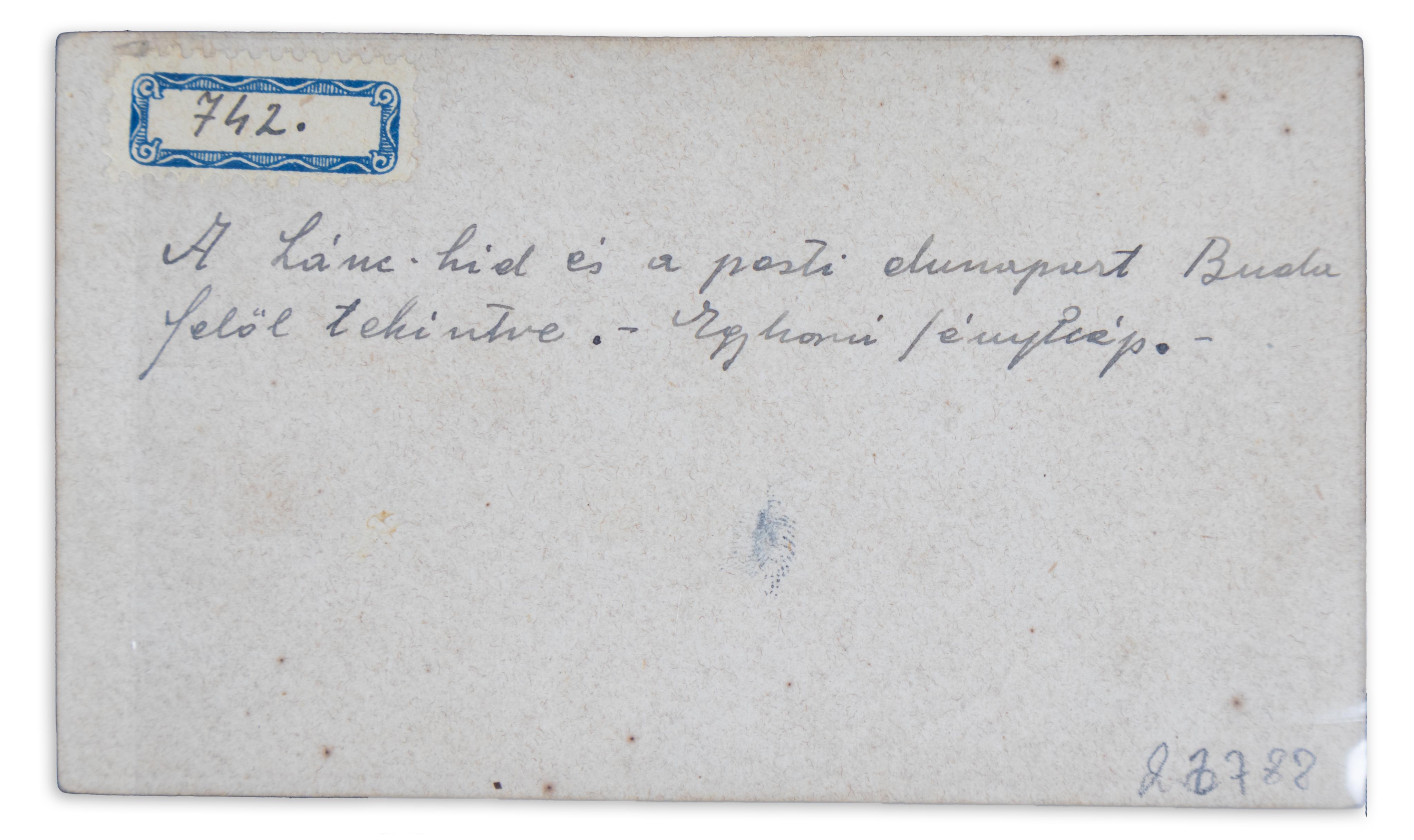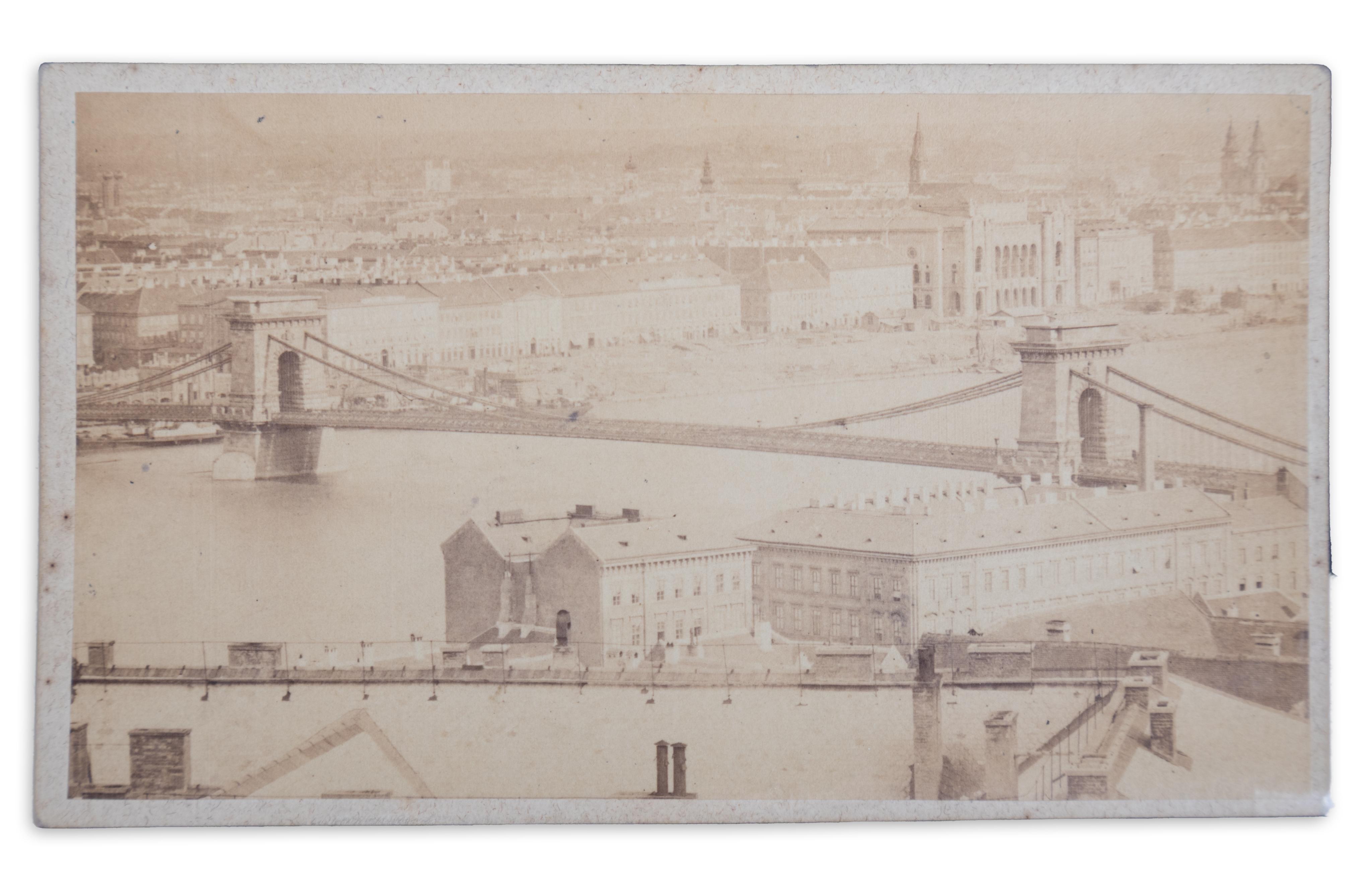 Készítője ismeretlen, poz., albumin, monokróm fotográfia. Vizitkártyaméret, vékonyabb papíron. Karton méret: 10,8×6,3 cm. Képméret: 10,2×5,9 cm. A tiszta felvételen jól kivehető a még kiépítetlen rakpartok rakodó hajókkal, a Vigadó, mellette az Angol Királynő Szálló, valamint a Heinrich, Hudetz, Kehrer, Wurm, Rupp-ház és az egykori hajóhíd vámházai. Az előtérben a Lánchíd Társulat székházaként szolgáló épület terveit Ybl Miklós készítette 1867-ben, neoreneszánsz stílusban.