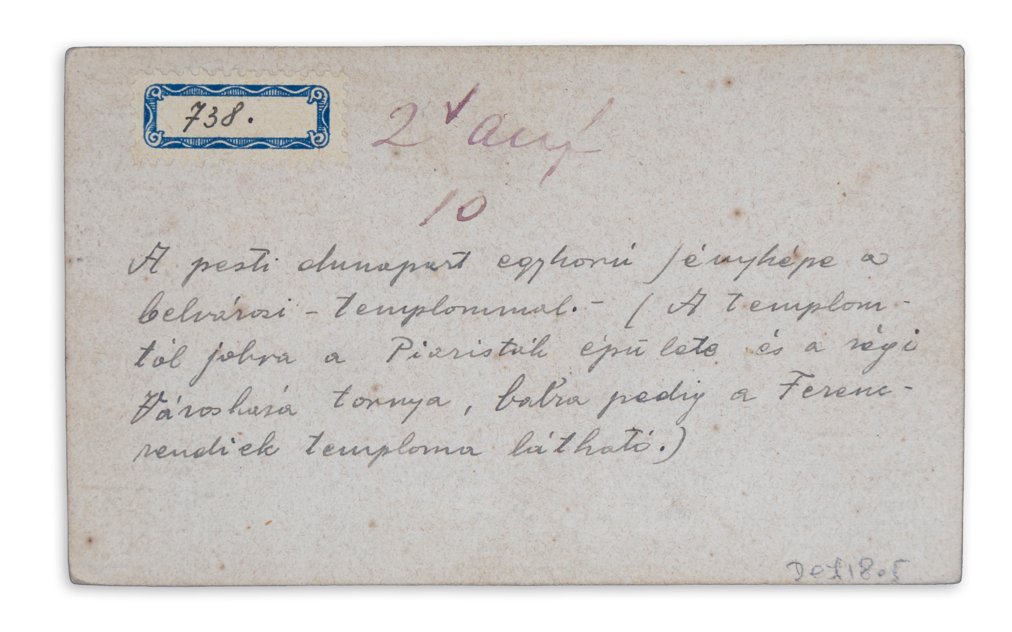 Készítője ismeretlen, poz., albumin, monokróm fotográfia. Vizitkártyaméret, vékonyabb papíron. Karton méret: 10,8×6,5 cm. Képméret: 10,3×6,1 cm.  A mai Március 15-e téren, az Erzsébet-híd pesti hídfőjének északi oldalán álló tekintélyes kéttornyú templom a Budapest-Belvárosi Nagyboldogasszony Főplébánia-templom. Előtte a később elbontott Szentháromság-szobor. Mögötte a Dohány utcai zsinagóga két hagymakupolája is látszik. Balra a piaristák-kegyesrendiek régi rendháza, mögötte a régi Városháza tornya emelkedik ki. Jobbra a Ferences templom, az előtérben, a még kiépítetlen rakpartnál rakodó uszály.
