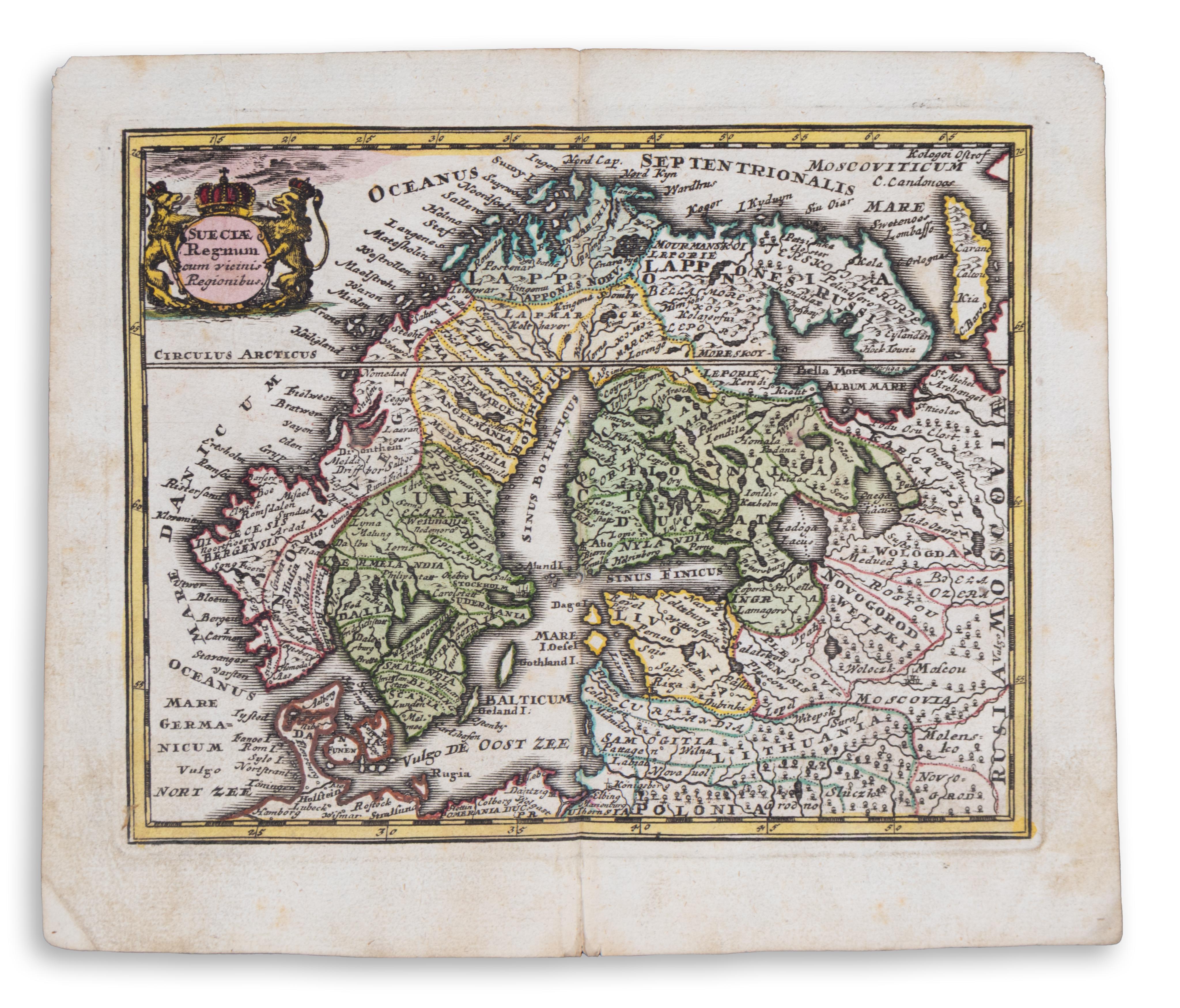 Scandinavia. Sweden, Norway Finland, Denmark, Poland, Northwest Russia. Contemporary colored copperplate engraving. Sheet size: 20.5×18 cm. In good condition, nice cartouche at the top left. Decorative regional map from a scarce A.F. Zurner atlas. His work resulted in the Atlas Augusteus Sauronicus (40 maps plus key sheet), which remained incomplete until after Zurner's death, but was ultimately sold to Pieter Schenk in Amsterdam in about 1745.