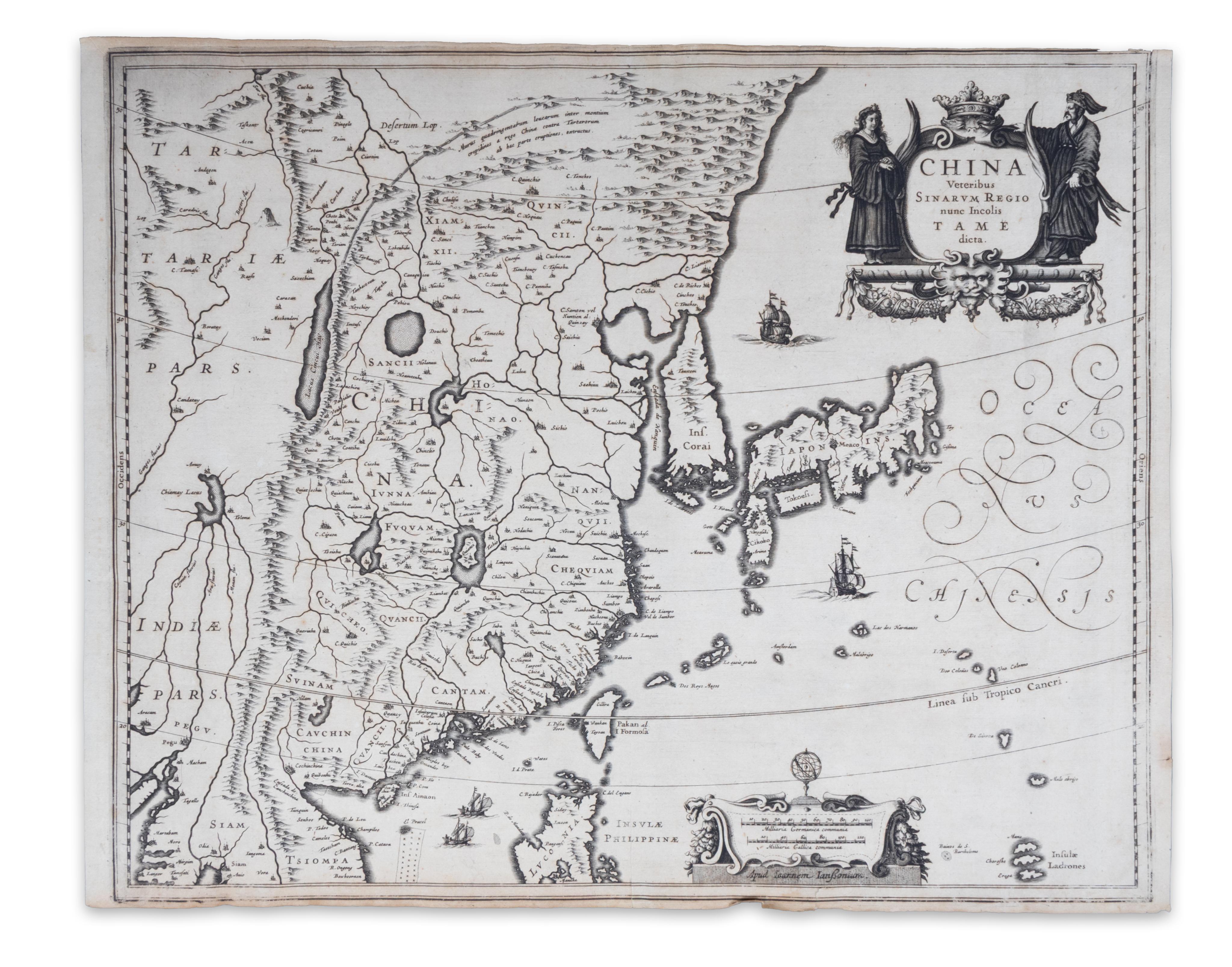 Decorative, copper-engraved map of China, Japan, Korea, and the northern part of the Philippines. A slightly reduced version of Willem Janszoon Blaeu’s 1634 work of the same title. The map contains several cartographic mistakes, such as the Korean Peninsula shown as an island, the Japanese island of Hokkaido completely missing, and an imaginary lake (called „Chiamay Lacus”) placed in India. Much of the information about China is from Luis Jorge de Barbuda, and is already depicted on the Ortelius sheets. The finely crafted frame decoration of the title field has a Chinese figure on both sides, while the other cartouche contains the linear scale, above it an elegant armillary sphere, and below it the name of the publisher. The map field is illustrated by the engraver with European galleons and junks/champagnes, and the Great Wall of China can be seen to the northwest. Our copy is a rare, early print with blank verso, sold as a separate sheet or as part of a composite atlas.