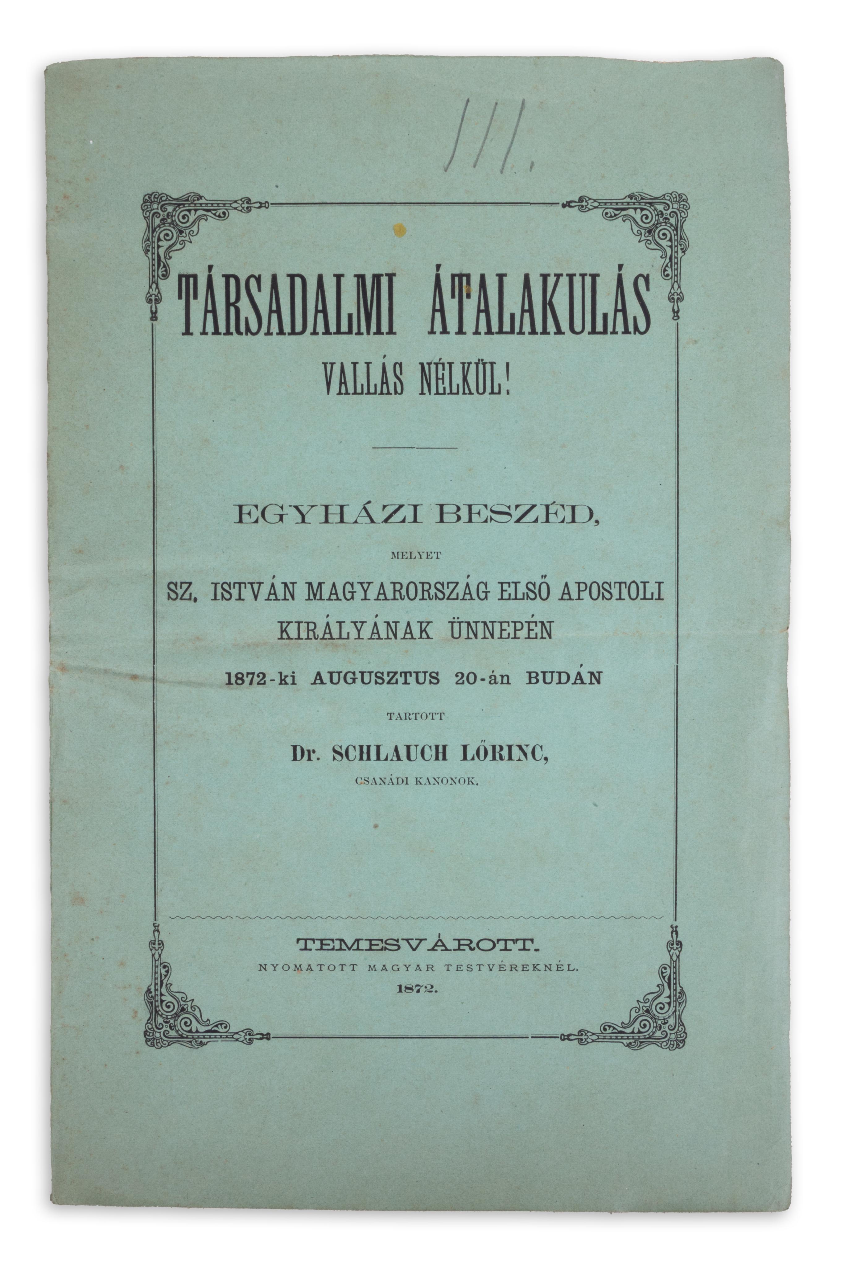 Egyházi beszéd, melyet Sz. István Magyarország első apostoli királyának ünnepén 1872-ki augusztus 20-án Budán tartott - - csanádi kanonok. 24 p.