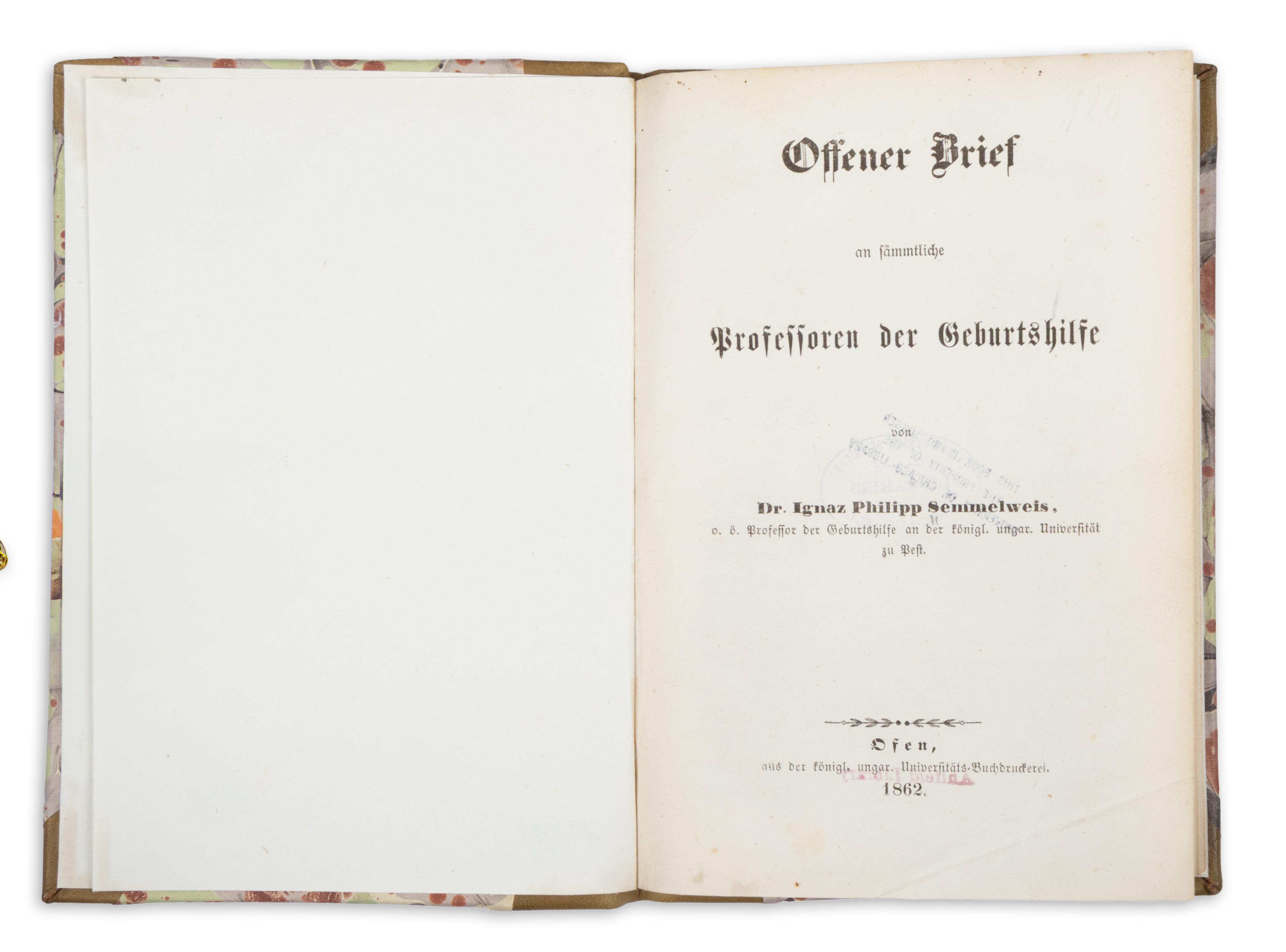 Ignaz Semmelweis made his breakthrough discovery on the causes and prevention of puerperal fever while working at the obstetric clinic in Vienna, later successfully applying his method as a professor at the University of Pest, where it nearly eliminated the infection. He published his theory between 1858 and 1861 in both Hungarian and German, most notably in Die Aetiologie, der Begriff und die Prophylaxis des Kindbettfiebers. Despite official support in Hungary, Semmelweis’s ideas were largely misunderstood or ignored abroad. In response, he wrote open letters to prominent foreign obstetricians and later addressed the entire obstetrical profession in a work published in Buda in 1862. Although some physicians accepted his theory, most rejected it, sparking intense scientific debate. Today, the publication is considered a rare and important document in the history of international medical literature.