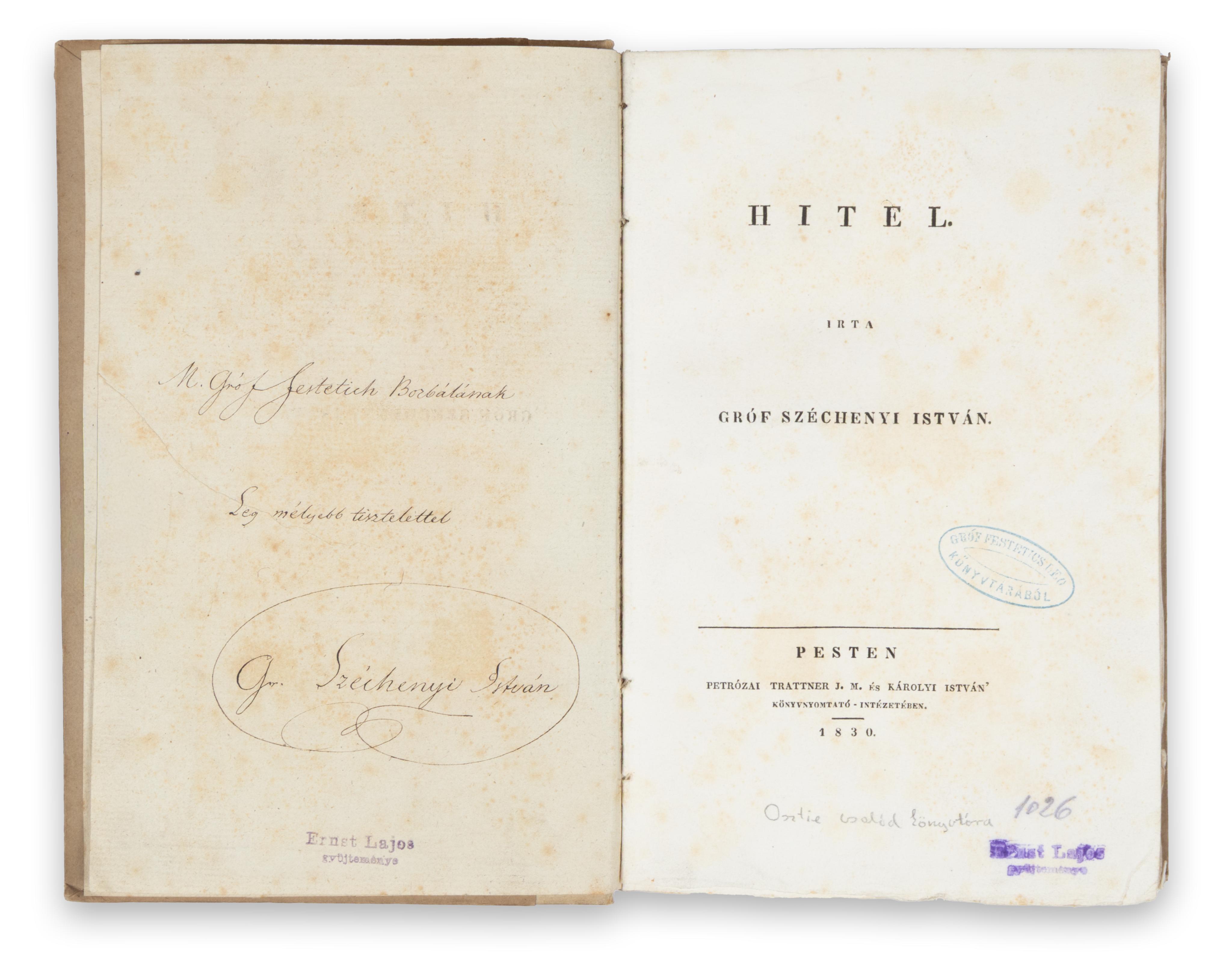 Pesten, 1830. Trattner és Károlyi.Signed Dedication Copy of Hitel, considered to be the Manifesto of the Hungarian Reform Movement.