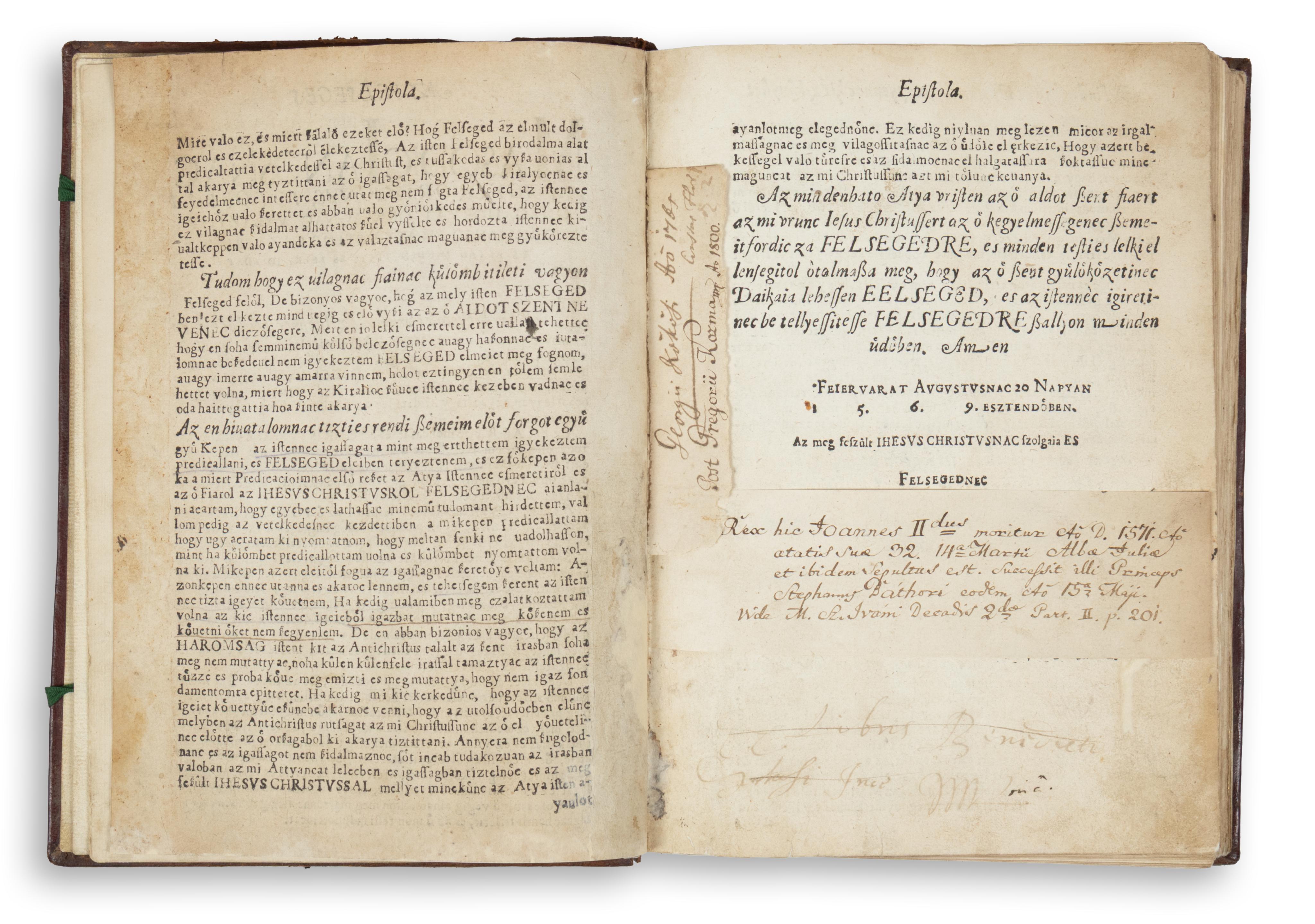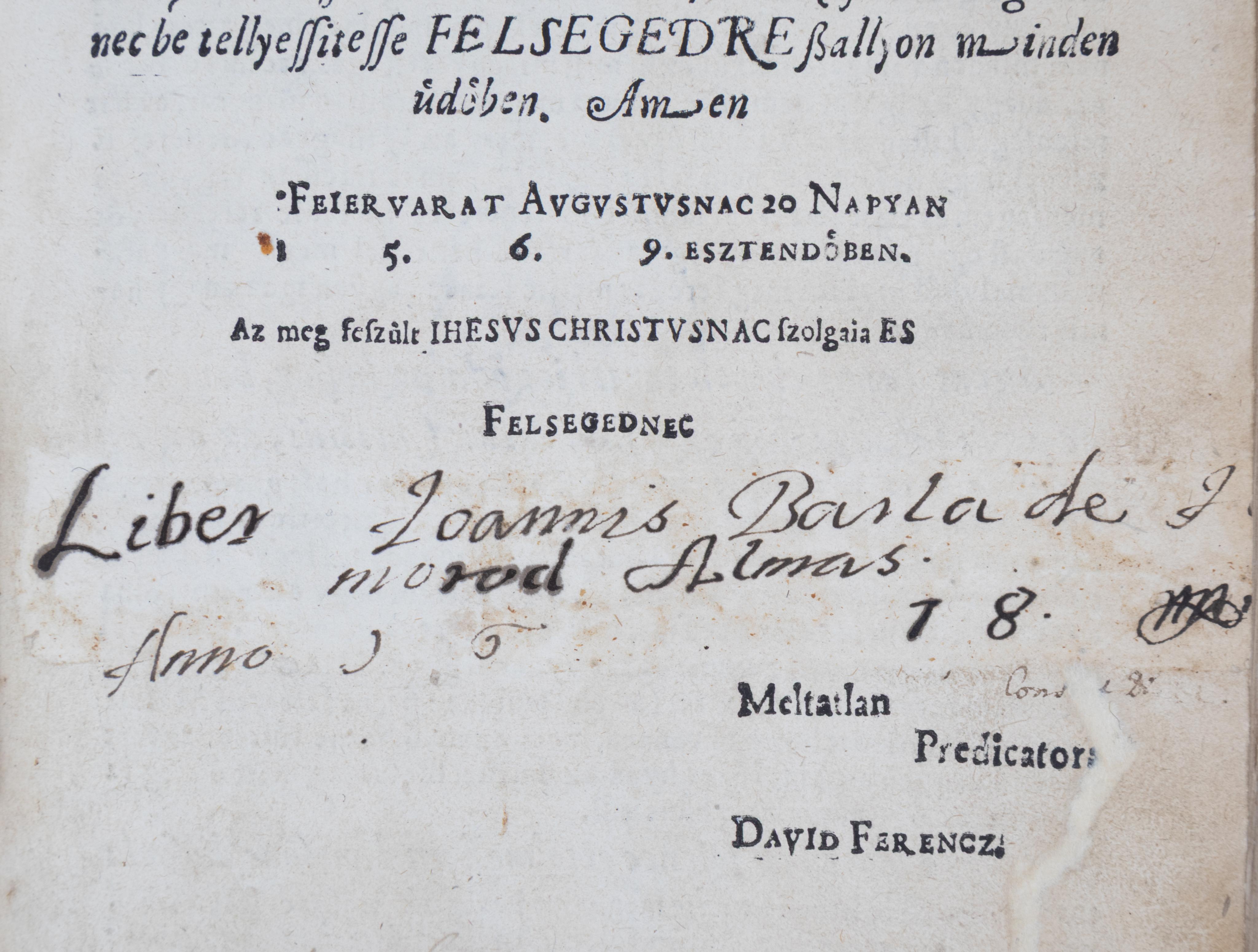 A magyar használat a nyomtatvány magyar nyelve folytán magától értetődő, a kézírásos bejegyzések pedig szinte folyamatosan tájékoztatnak a magyar tulajdonosokról, bár talán éppen a legkorábbit kitörölték. A további bejegyzések:Ex libris Benedicti Czukasi Ince mp. (áthúzva); Liber Ioannis Barla de Homorod-Almás Anno 1678 mp. (feltehetően ő készíttette a kötést); Georgii Kökösi Anno 1765;