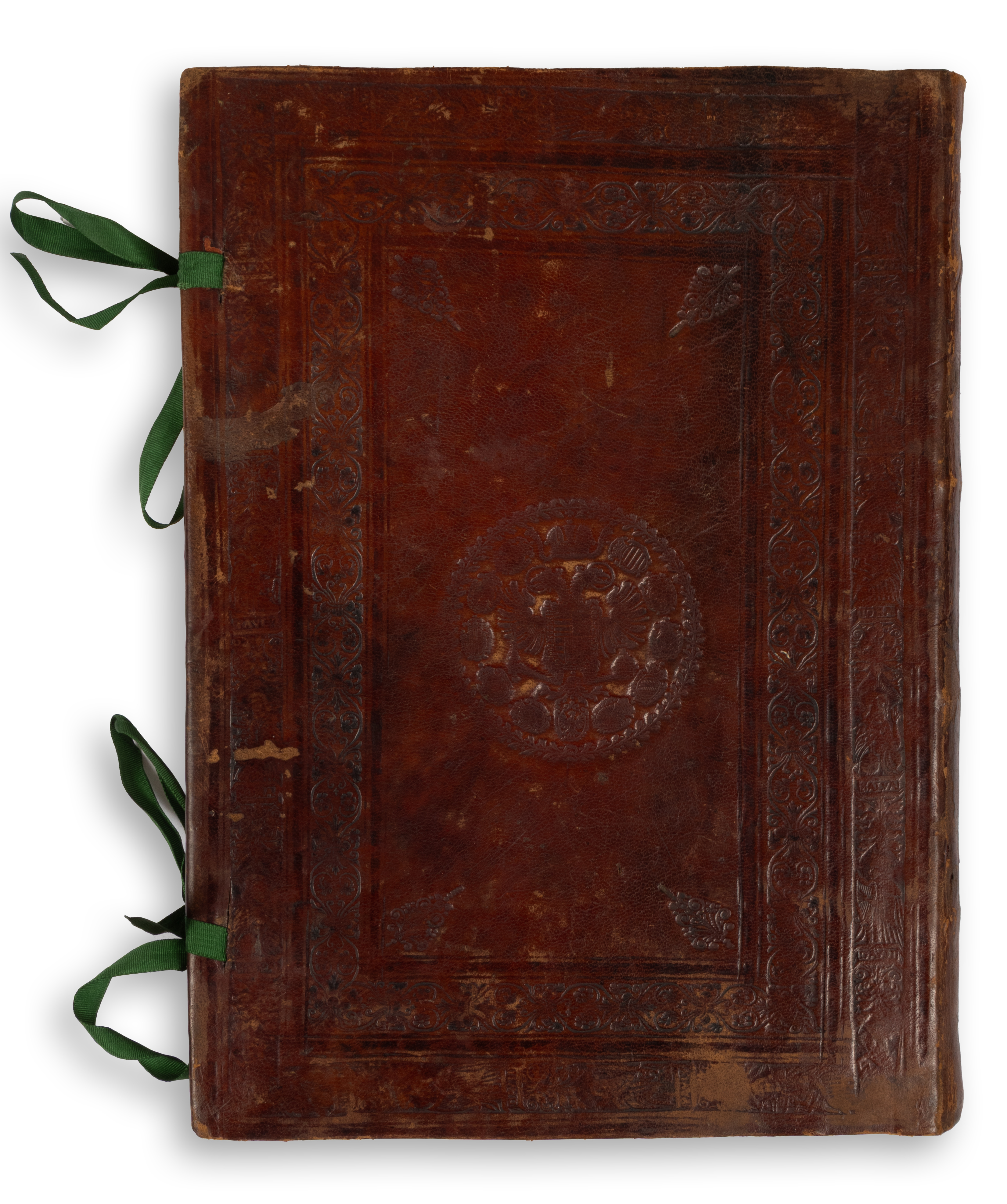 In a mid-17th-century Pressburg (Bratislava), blind-stamped reddish-brown leather binding over wooden boards.