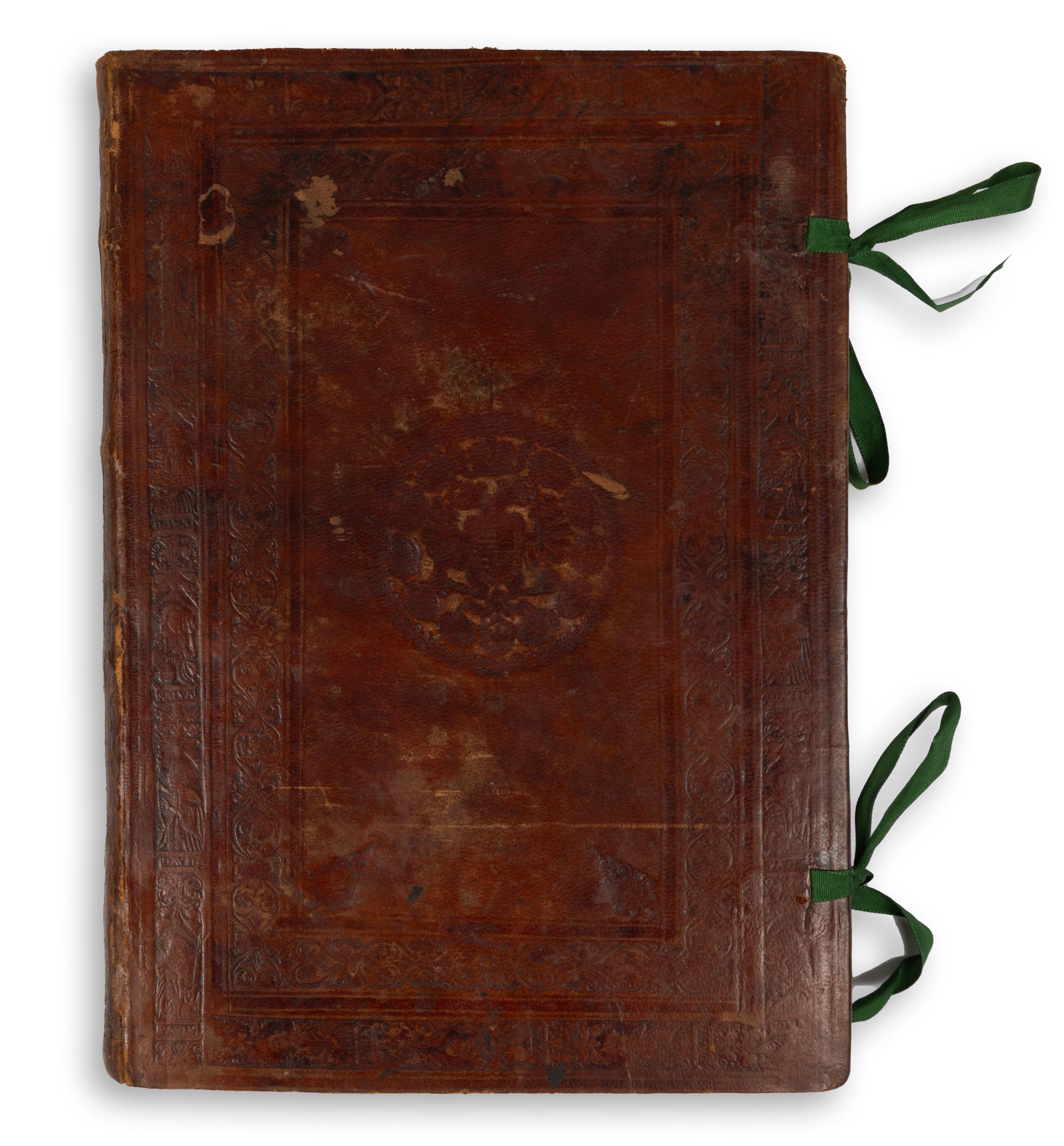 Ez a görgető a 16. század jellegzetes képviselője, a második keretben látható virágos-indás görgető azonban már 17. századi. A nagyméretű középmező négy sarkába egy-egy stilizált virágminta került, közepébe pedig egy babérkoszorúval övezett, 60 mm átmérőjű, kör alakú lemez az osztrák birodalmi címerrel, körülötte a tartományi címerekkel. A gerinc díszítetlen, restaurált, a könyvet újrafűzték.  A táblák két pár zöld selyemszalaggal köthetök össze. Metszése aranyozott. Ez. a kötés feltehetően a könyvnek már a második kötése.