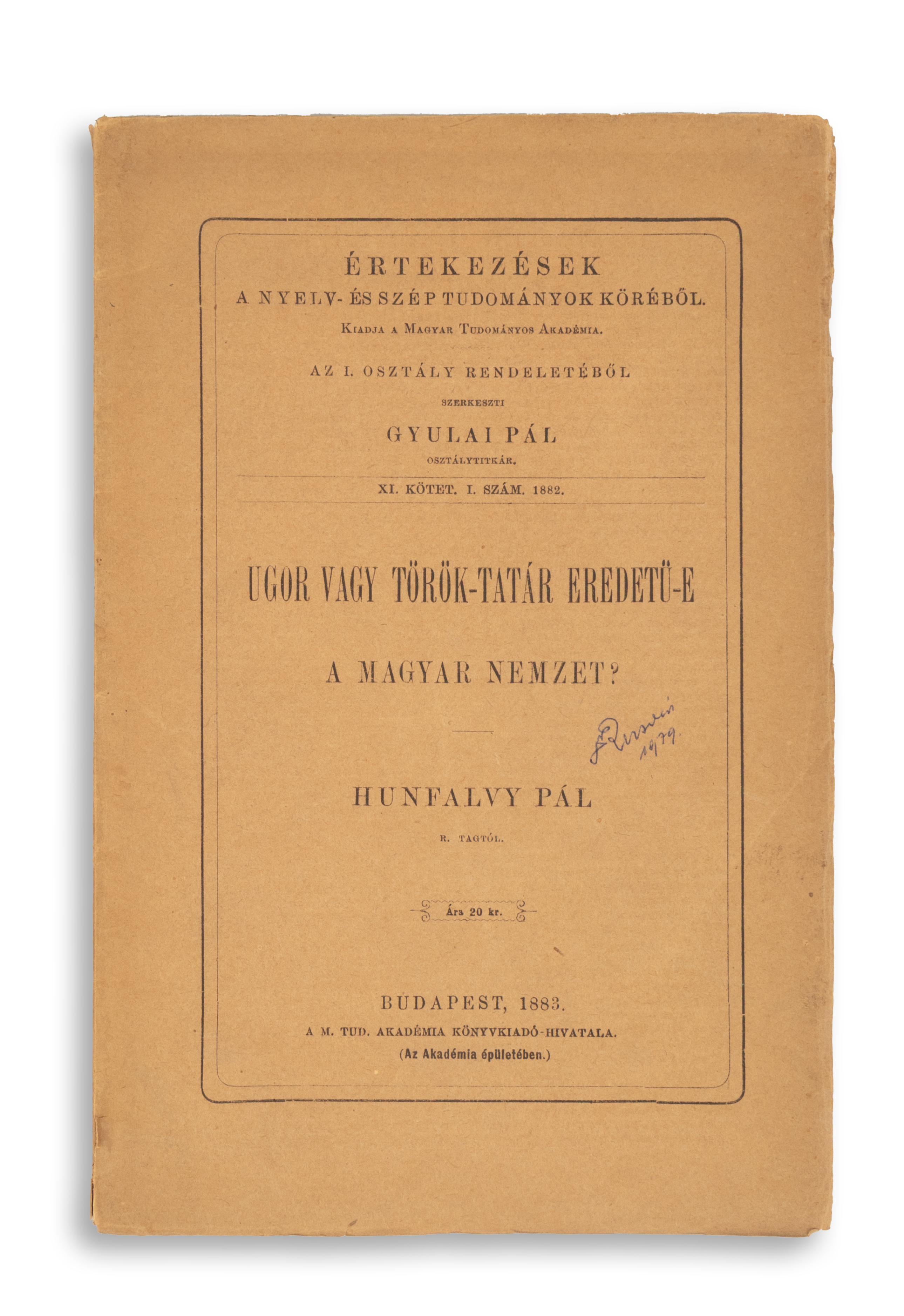 Bound, in original, inscribed paper cover, in good condition. Small name inscription on cover, MTA ex libris glued on verso.