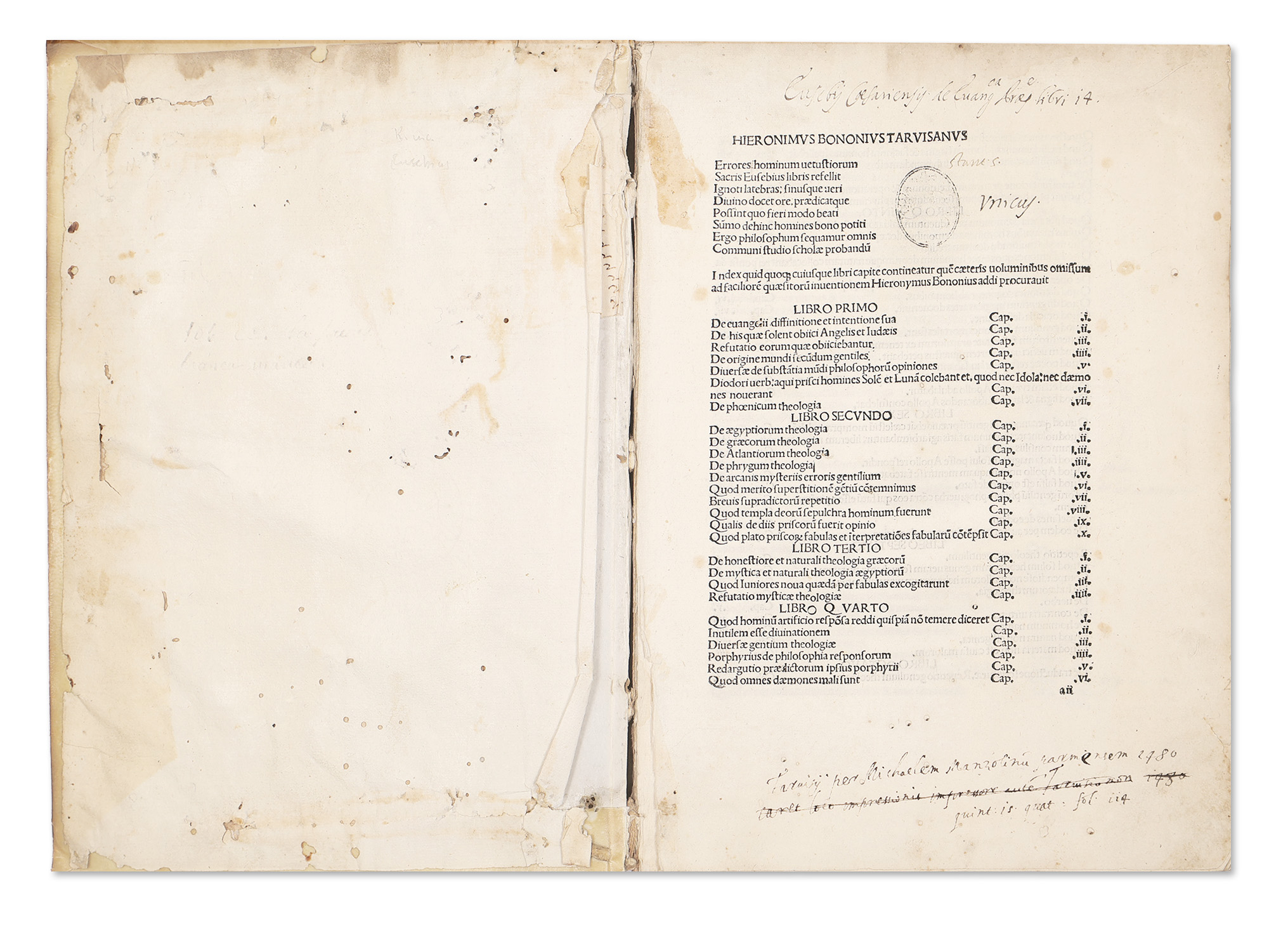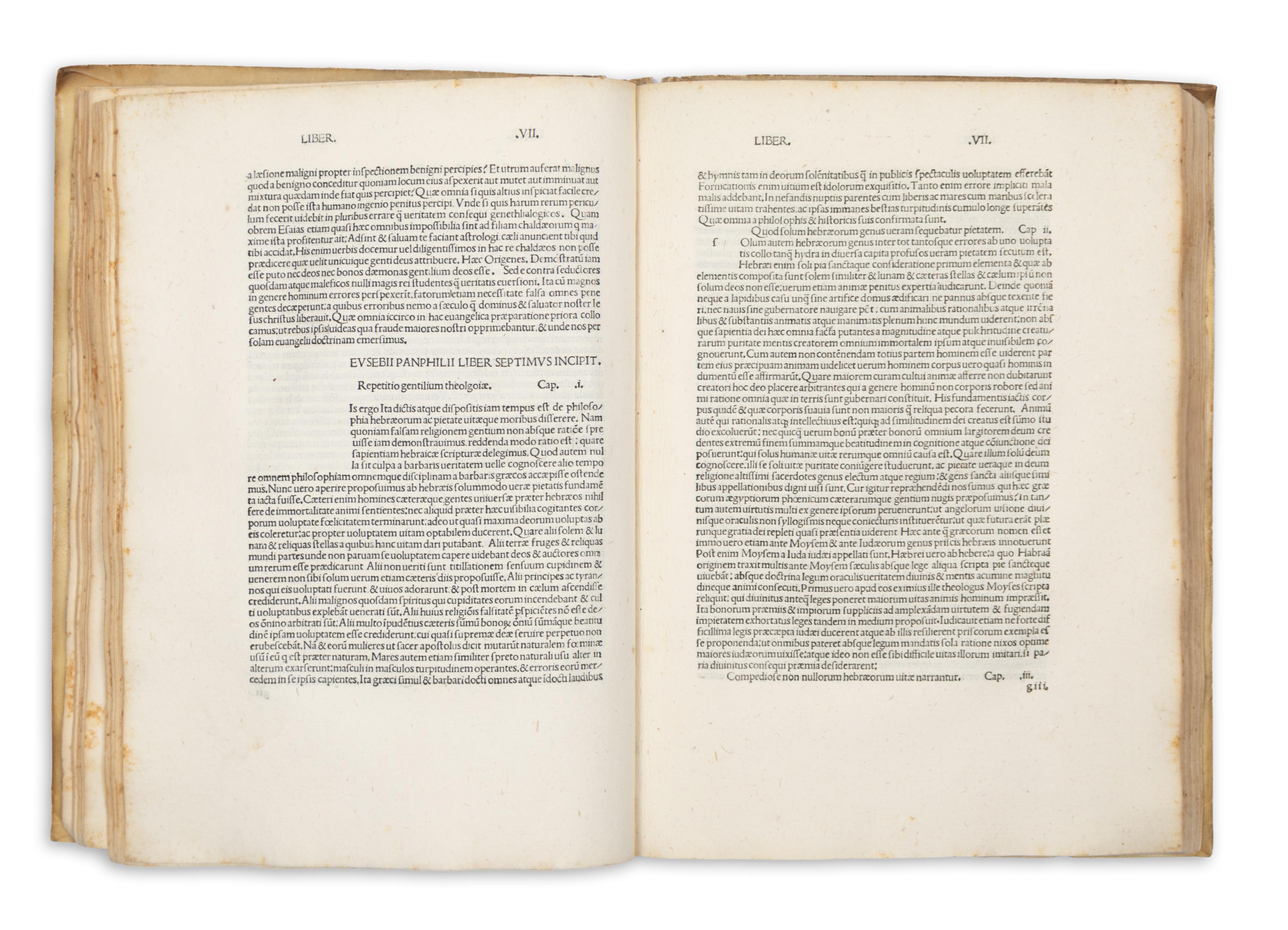 Eusebius Pamphilus (270–340), Bishop of Caesarea, had his work translated from Greek into Latin by Georgius Trapezuntius at the request of Pope Nicholas V. The work presents an apology of Christianity, as well as the pagan and Old Testament antecedents of the Gospels. Eusebius was the first Christian church historian and played a significant role in establishing the New Testament canon. He is especially known for his efforts to determine the time elapsed since the Creation and the date of Christ’s birth.