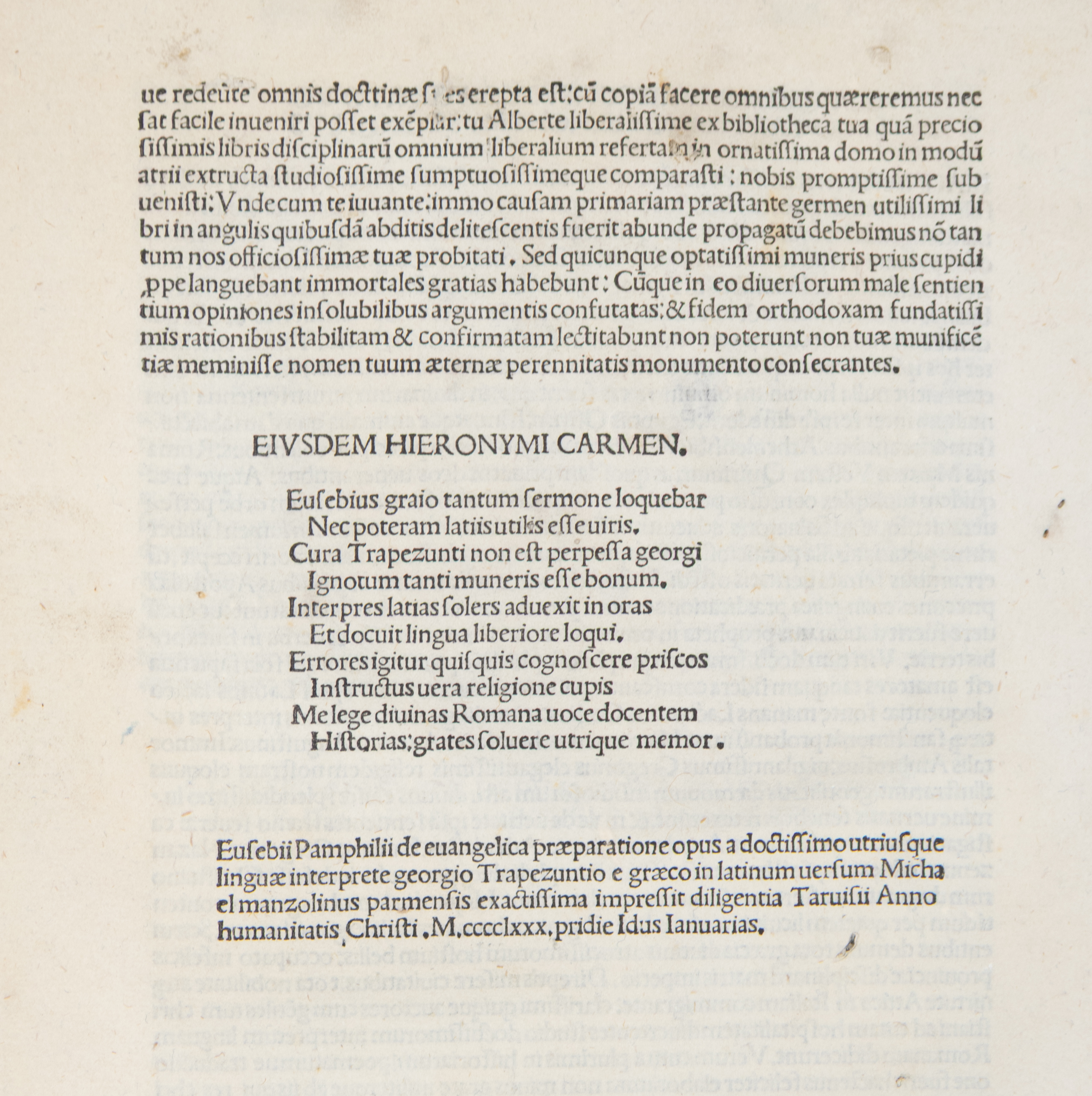 Eusebius Pamphilus (270-340) caesareai püspök munkáját V. Miklós pápa megbízásából Georgius Trapezuntius fordította görögből latinra. A munka a kereszténység apologiáját, az evangéliumok pogány és ószövetségi előzményeit tartalmazza. Eusebius az első keresztény egyháztörténetíró, fontos szerepet játszott az újszövetségi kánon megállapításában. Neve főleg a teremtés óta eltelt idő és Krisztus születési időpontjának meghatározásáról ismeretes.