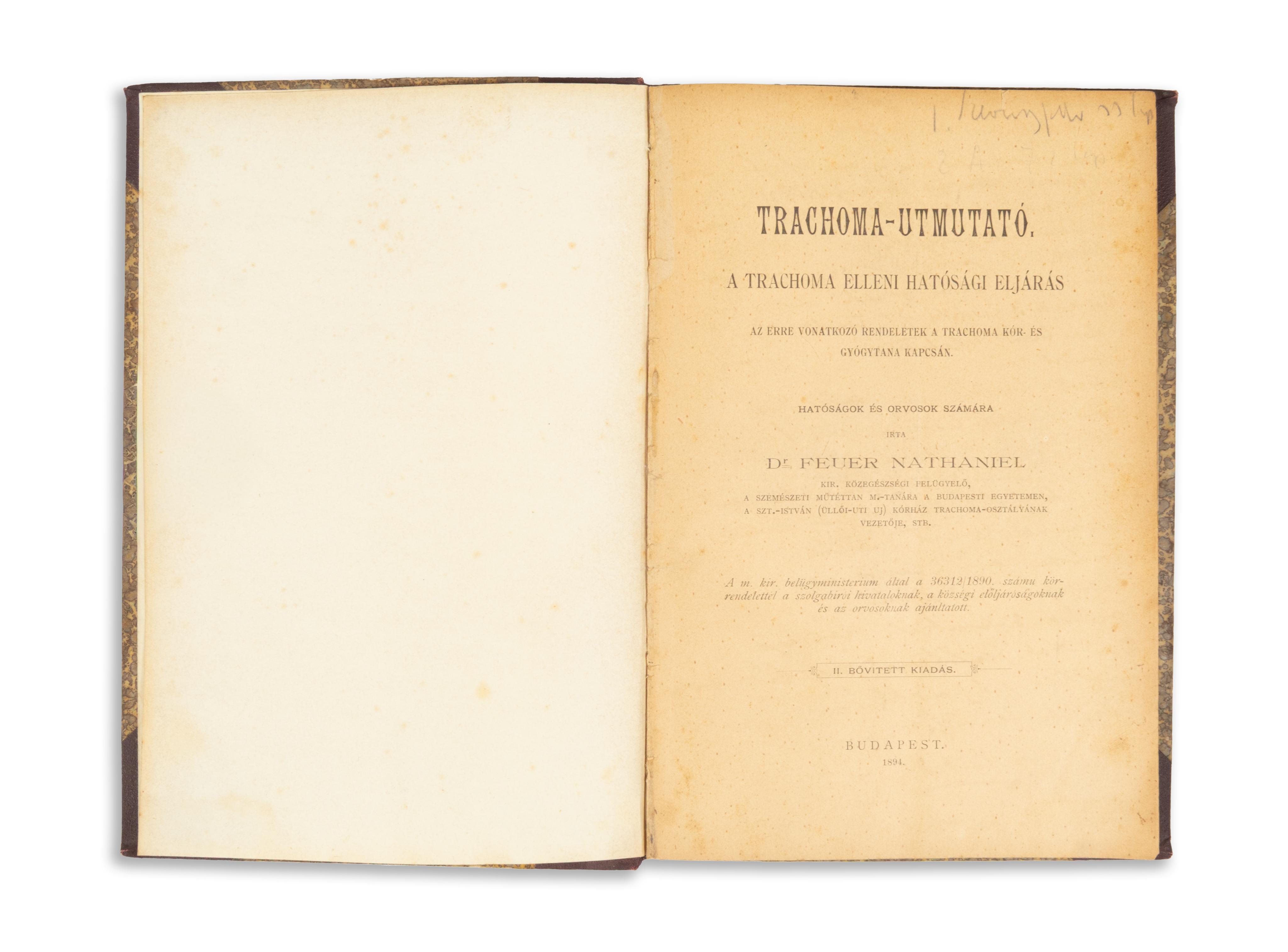 Hatóságok és orvosok számára írta - -. II. bővített kiadás.127 + [1] p. Címlapversón korabeli egészoldalas orvosi bejegyzés, szövegközti ceruzás aláhúzásokkal, utolsó levelén is jegyzetelés. Nagyon ritka mű. Az egyiptomi szembaj (szemcsés kötőhártya-gyulladás), a Chlamydia trachomatis baktérium okozta fertőző szembetegséget, amely a világ vezető, de megelőzhető fertőző vaksági oka, tárgyalja.