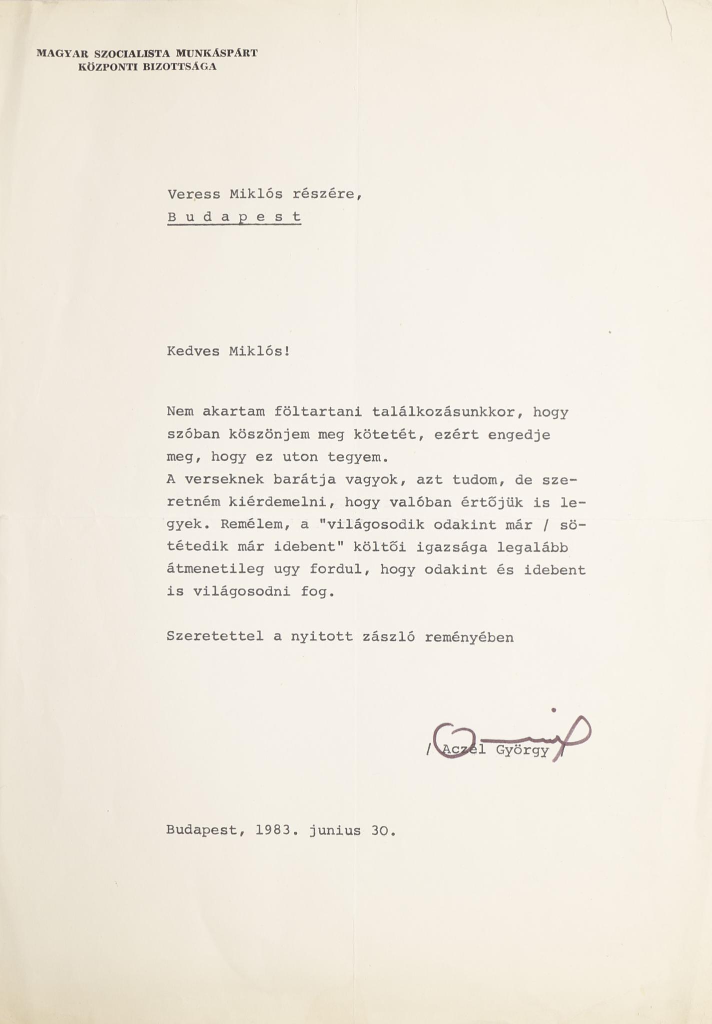Typescript, one insrcibed page signed by Aczél, on headed paper of the Central Committee of the Hungarian Socialist Workers' Party.