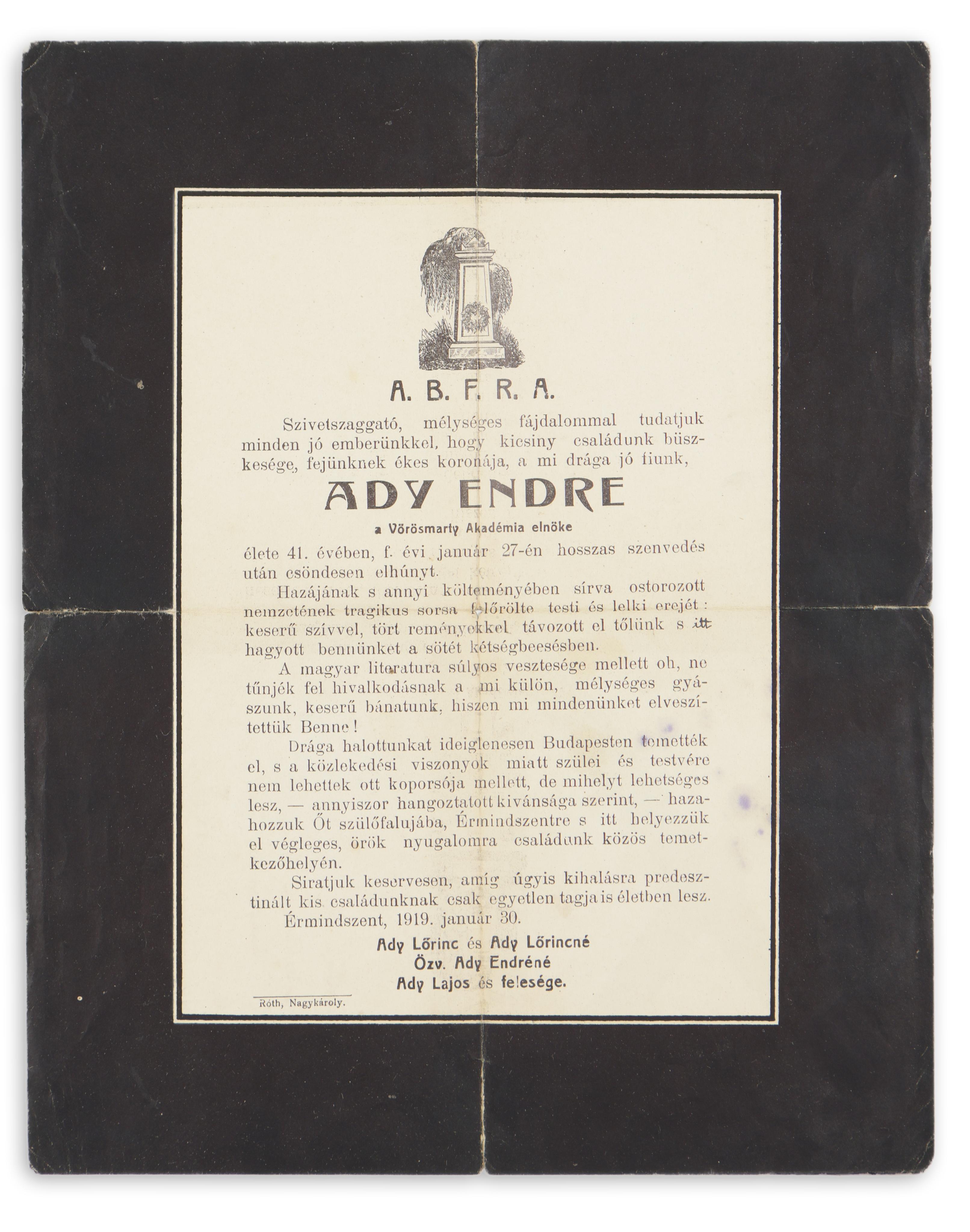 Printed obituary issued by the family of Endre Ady, autograph letter of thanks from Lajos Ady, printed condolence card of Csinszka and Ady commemorative number of Nyugat