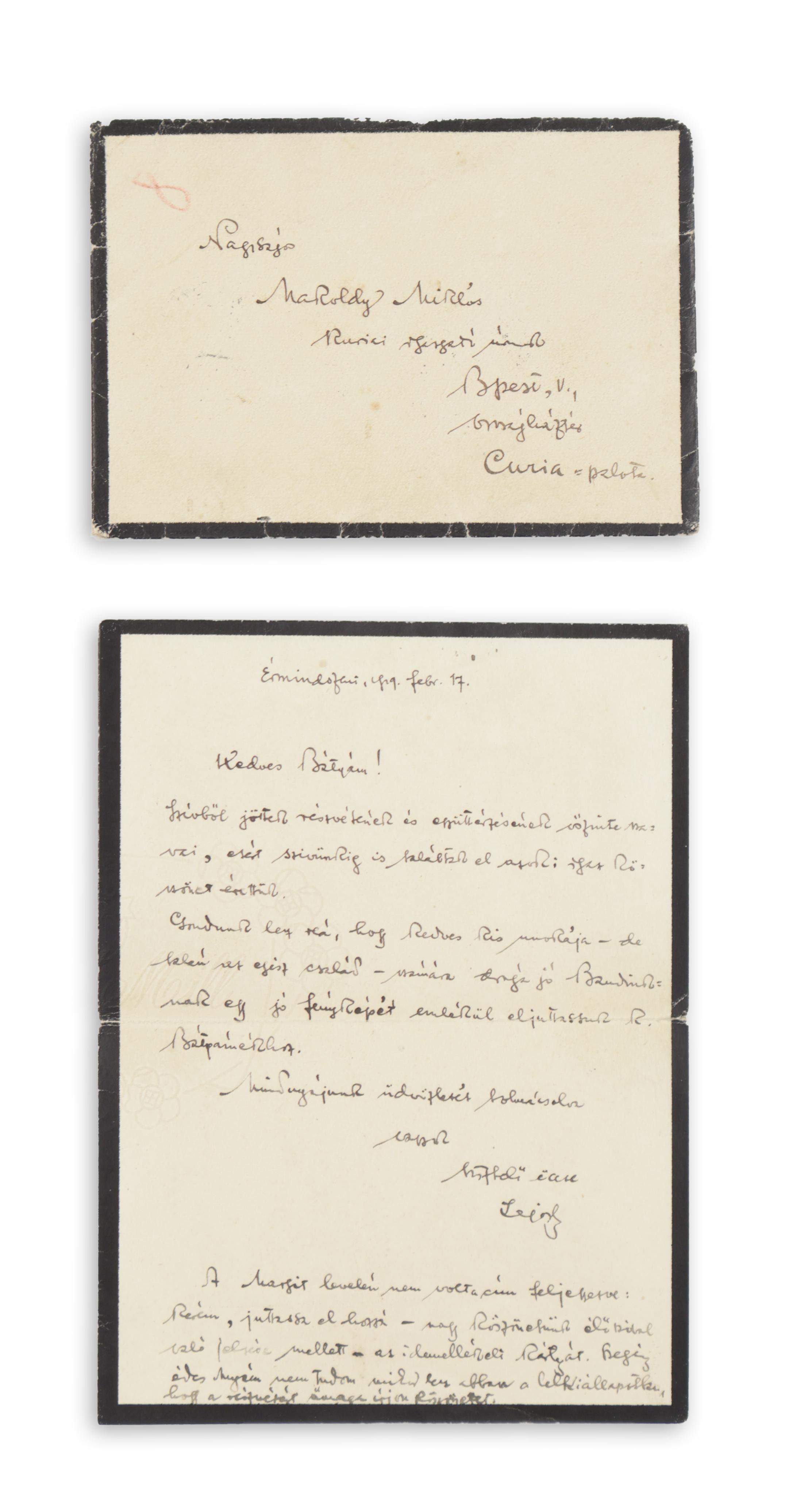 Egy, tintával beírt oldal, gyászkeretes levélpapíron, gyászkeretes postabélyegzett borítékban.