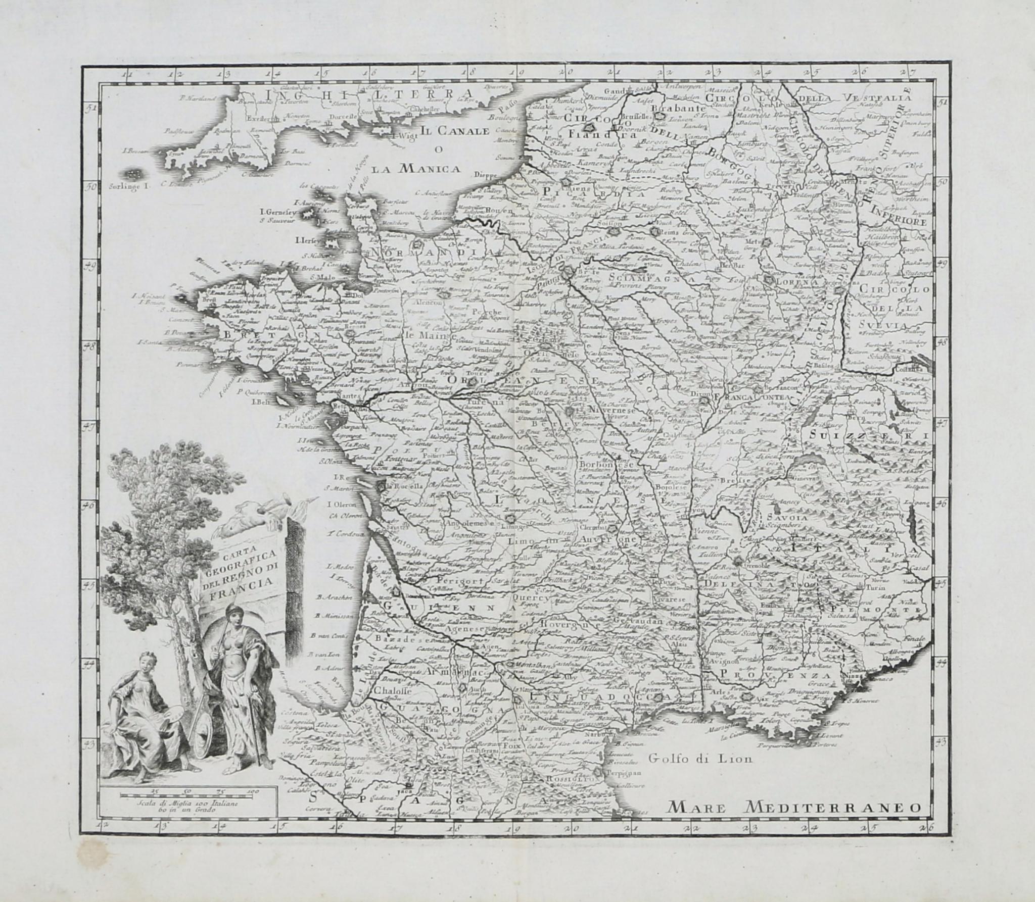 Franciaország antik rézmetszetű térképe, amely De L'Isle korábbi térképén alapul. Franciaország 18. századi falvait és városait ábrázolja. Elegáns címkartussal díszített.