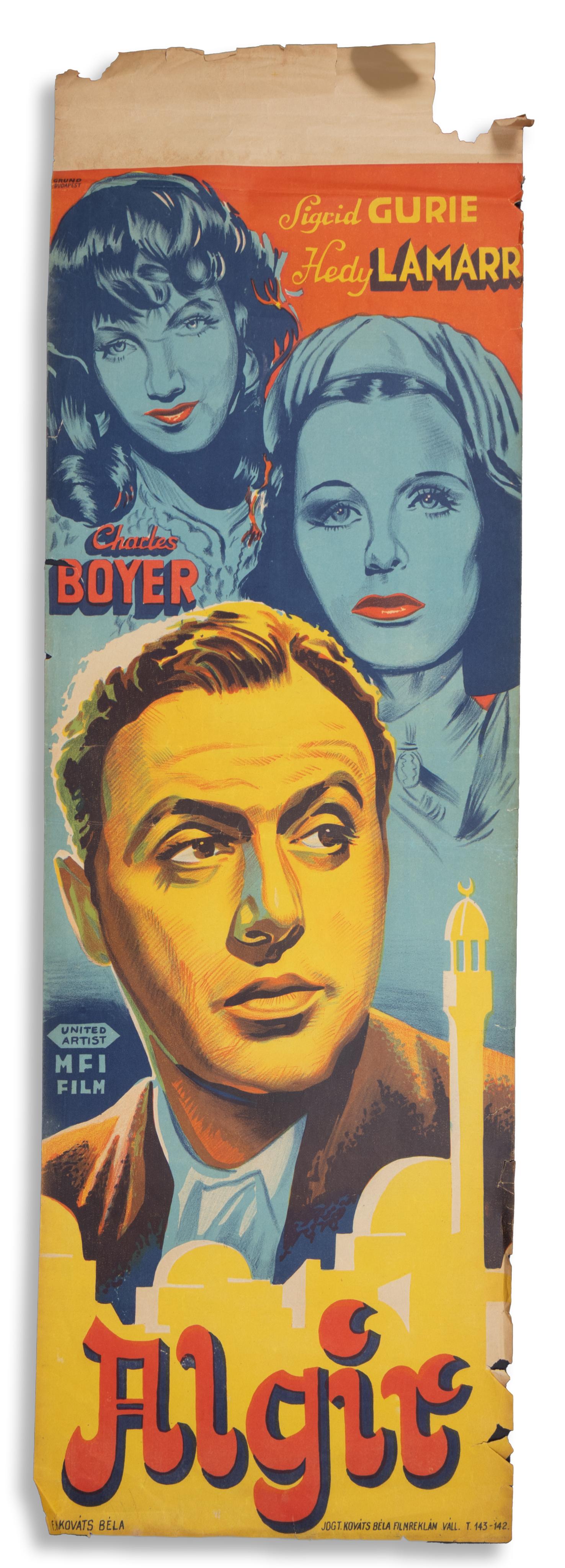 Az 1938-as Algiers című amerikai romantikus dráma magyar rácsplakátja. Rendező: John Cromwell. Író: Henri La Barthe. Forgatókönyvíró: John Howard Lawson, James M. Cain. Zene: Vincent Scotto, Mohamed Ygerbuchen. Szereplők: Charles Boyer, Hedy Lamarr, Alan Hale, Gene Lockhart, Joseph Calleia, Joan Woodbury, Sigrid Gurie, Walter Kingsford.