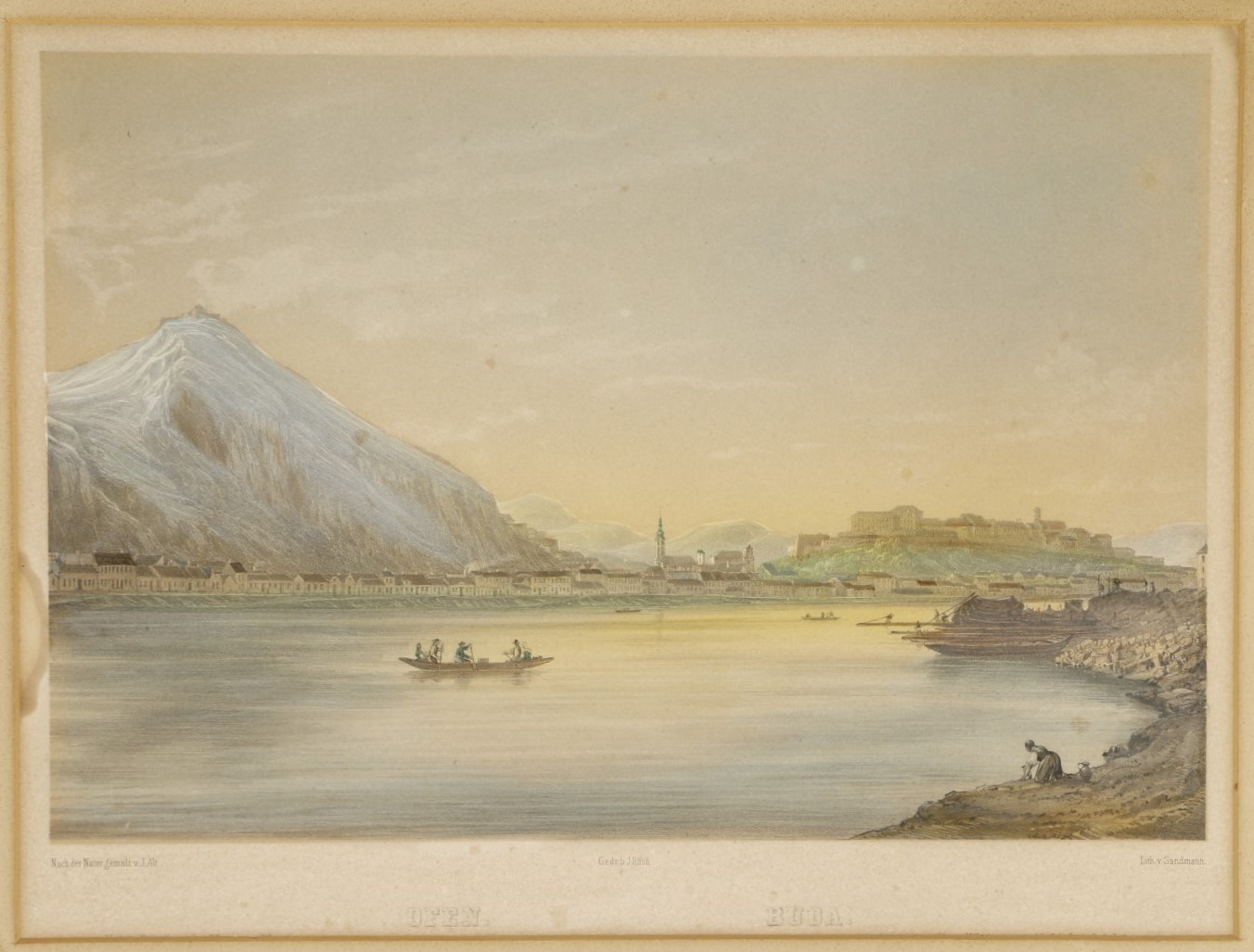 A view of Ofen/Buda: the Gellért Hill and the Castle Hill. Lithograph, published in 1851, based on an oil painting by Jacob Alt.