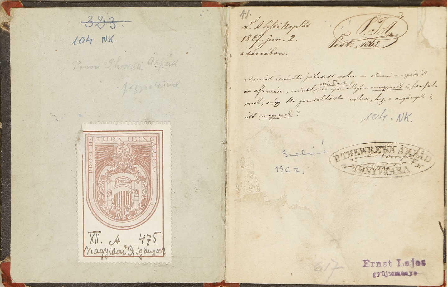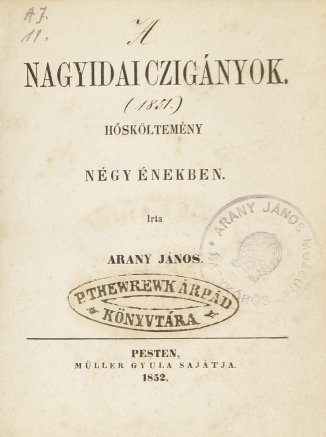 Possessor: A kötéstábla versoján az Ernst Múzeum „Pro Cultura Hungarica” ex-librise, mely, a rajta lévő címmel és számmal jelzi, hogy az egykor Ernst Lajos gyűjteményébe tartozó mű hol szerepelt a múzeum állandó kiállításán. Az előzéklapon Ernst Lajos gyűjteményi pecsétje, a címlapon, a szövegközben és a hátulsó előzéklapon az Arany János Múzeum, Nagykőrös, valamint P. Therewk Árpád Könyvtárának pecsétjei. Az előzéklap rectoján P.T.Á. monogram dátummal: Pest, 1862, valamint „L. A Pesti naplót 1867. jun. 2. a tárcában”. Itt olvasható az Arany János művét övező vita egyik kulcsgondolata is, Therewk tollából: „Annál kevésbé jöhetett volna az olvasó magától az eszmére, mintha mindjárt az epos elején magyarok is szerepelnek; s így ki gondolhatta volna, hogy a cigányok is itt magyarok?”