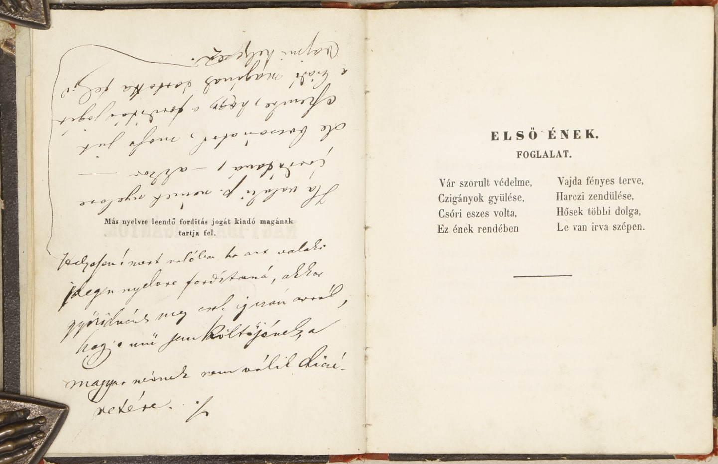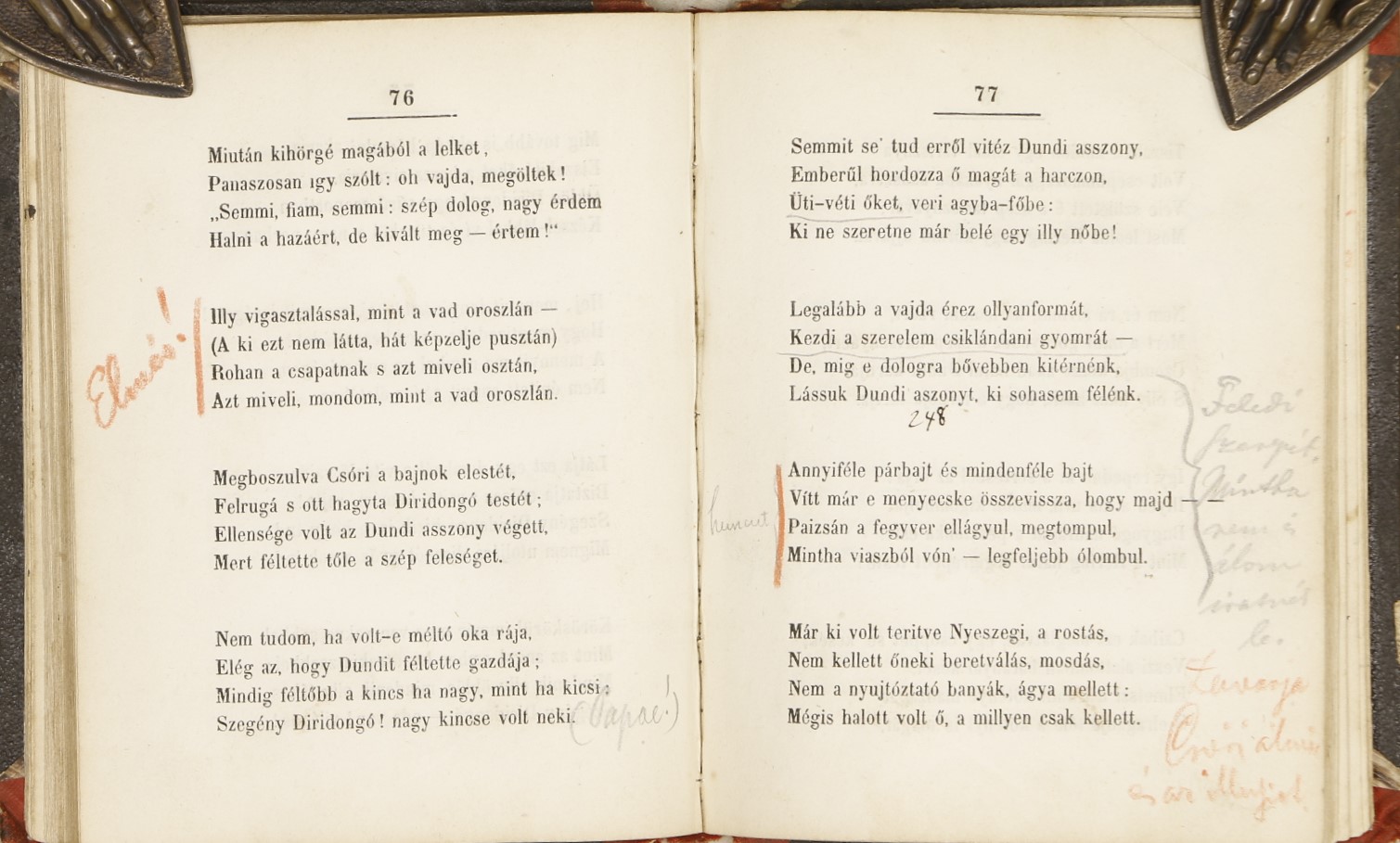 A szövegközben fekete és piros ceruzás, valamint P. Therewk Árpád (1839–1903) irodalomtörténész, kritikus tollából származó fekete tintás aláhúzások és megjegyzések találhatóak. A negyedik oldalon pedig, szintén a mű megítélésére vonatkozó rájegyzése látható: „Ha valaki p. német nyelvre fordítaná, - akkor – de bocsánat, most jut eszembe, hogy a fordítás jogát a kiadó magának tartotta fel, s vajmi helyesen. Folytatom! mert valóban, ha azt valaki idegen nyelvre fordítaná, akkor győződnénk meg csak igazán arról, hogy e mű sem költőjének, sem a magyar névnek nem válik dicséretére.”
