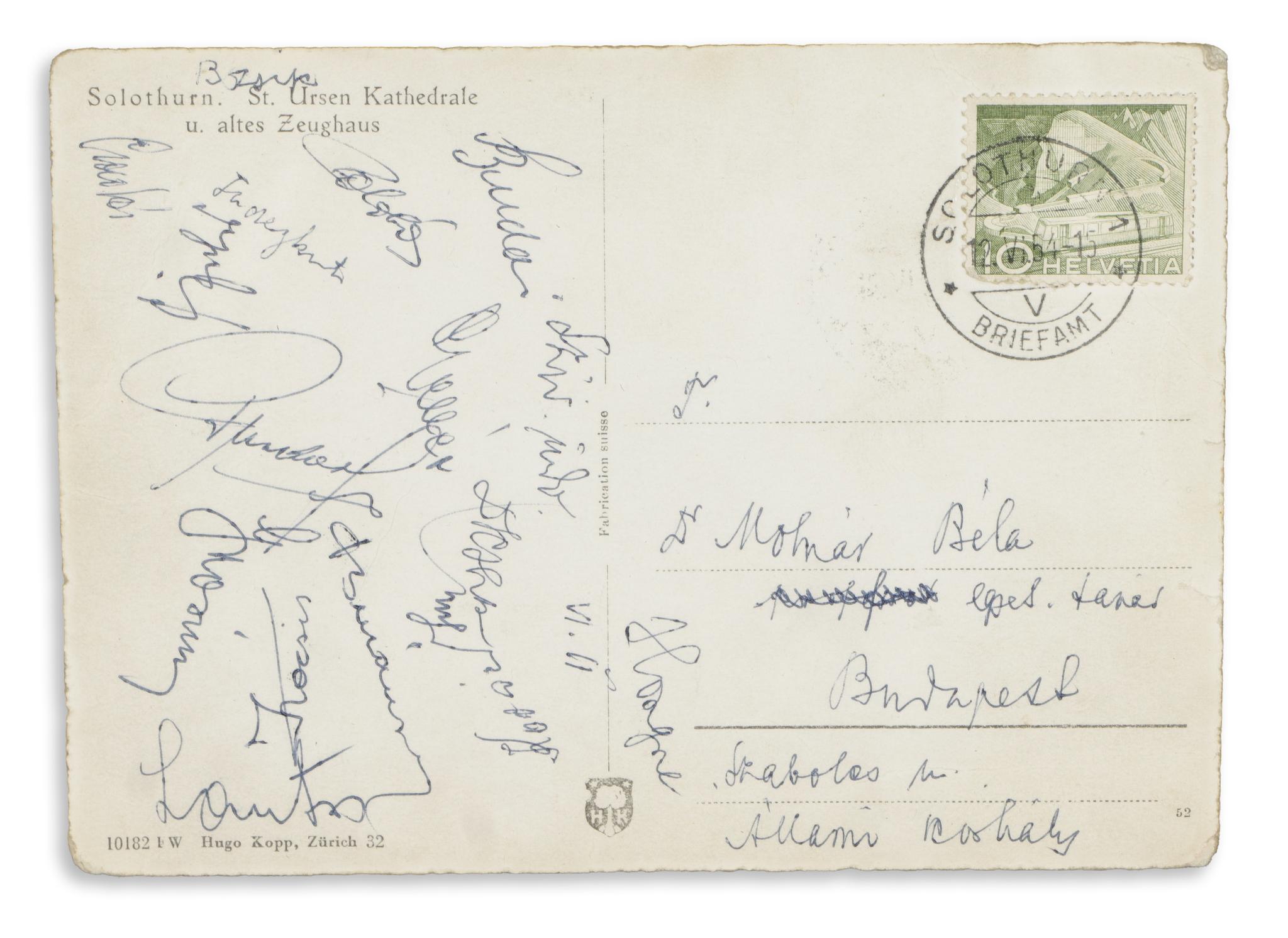 The 14 signatures on the card are from members of the Hungarian football team that took part in the 5th World Cup in Switzerland in 1954. The team played the defending champions Uruguay at the Olympic Stadium in Lausanne, scoring 4-2 in favour of the Hungarians. The Hungarian ”Golden Team” won the silver medal in the tournament.