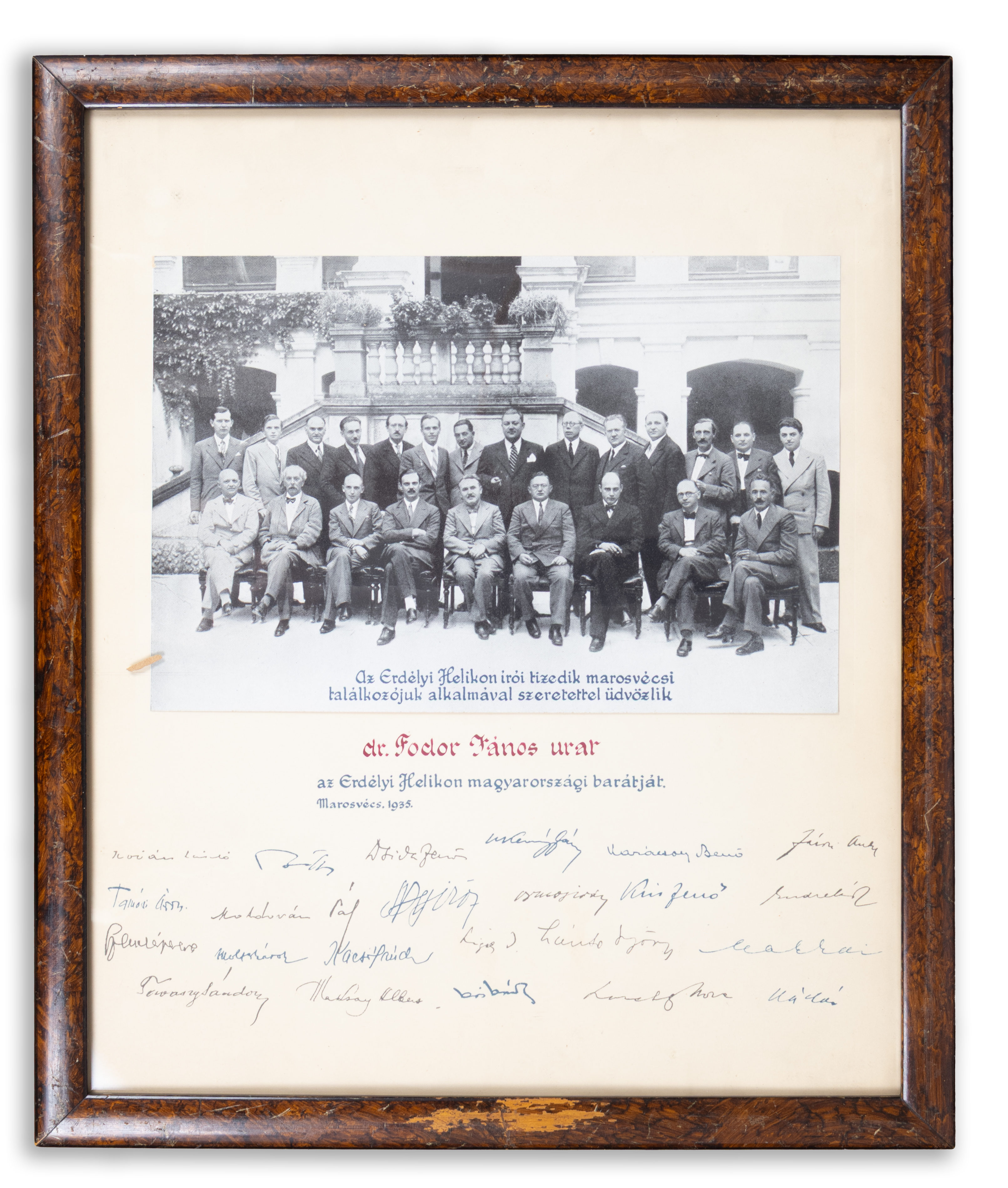 Marosvécs, 1935„Az Erdélyi Helikon írói tizedik marosvécsi találkozójuk alkalmával szeretettel üdvözlik dr. Fodor János urat az Erdélyi Helikon magyarországi barátját. Marosvécs, 1935. ”