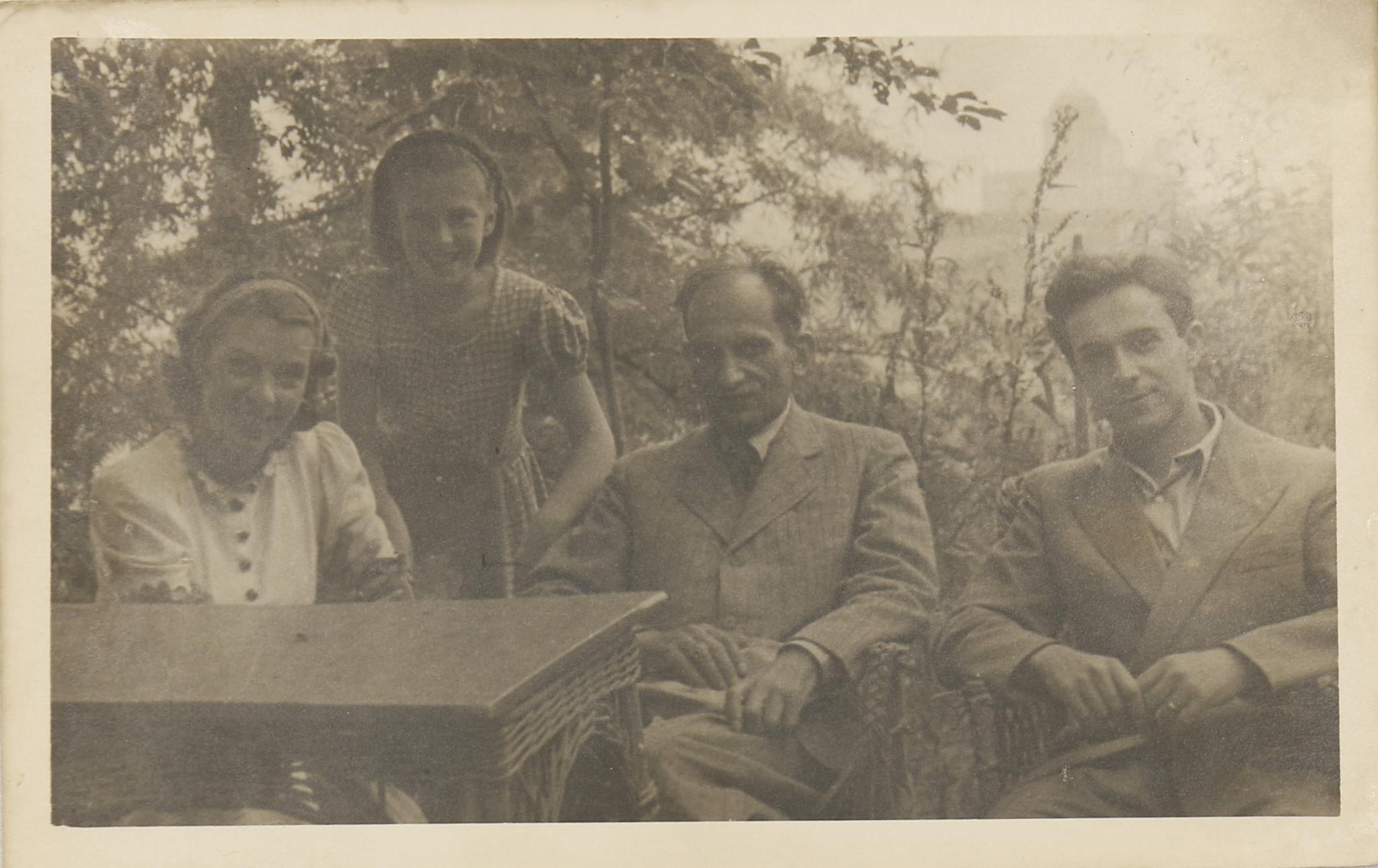 Babits Mihály (1883-1941) költő, író, műfordító, Devecseri Gábor (1917-71) költő, Devecseri Gáborné szül. Huszár Klára (1919-2010) operarendező, szövegíró és fogadott leánya, Babits Ildikó (1928-1982) társaságában. A felvételt Török Sophie készítette.