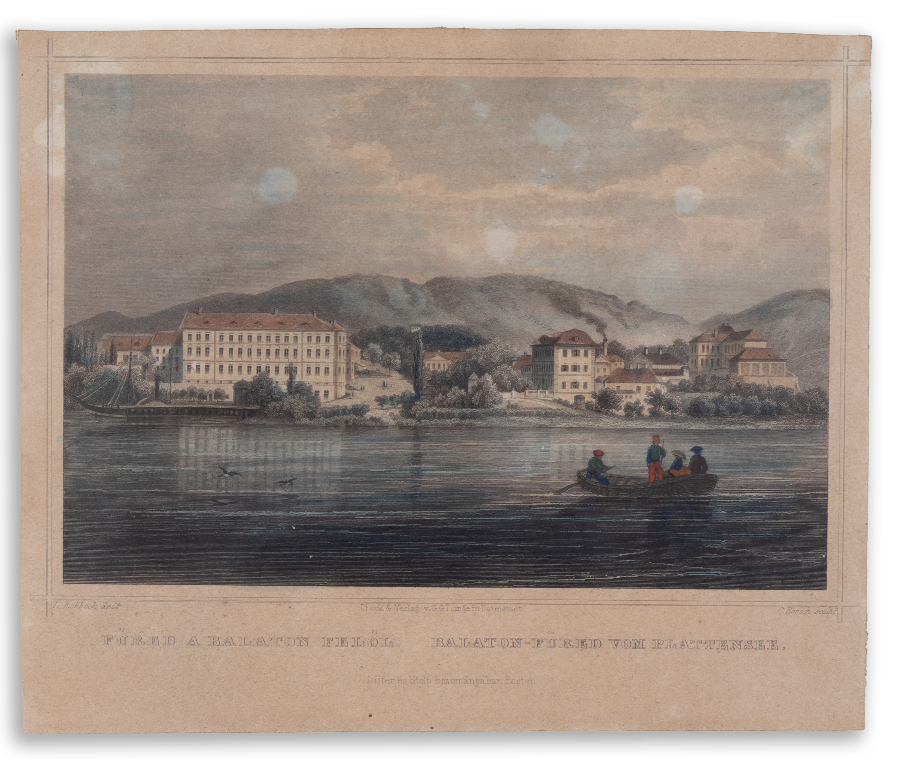 Darmstadt, 1856. G. Lange. Színezett acélmetszet. Metszette: C. Rorich.  Lapméret: 21,8×17,8 cm. Képméret: 12×16,5 cm. Keretezve: 19×25 cm. Halvány, világos foltokkal. (Balaton, Balatonfüred)