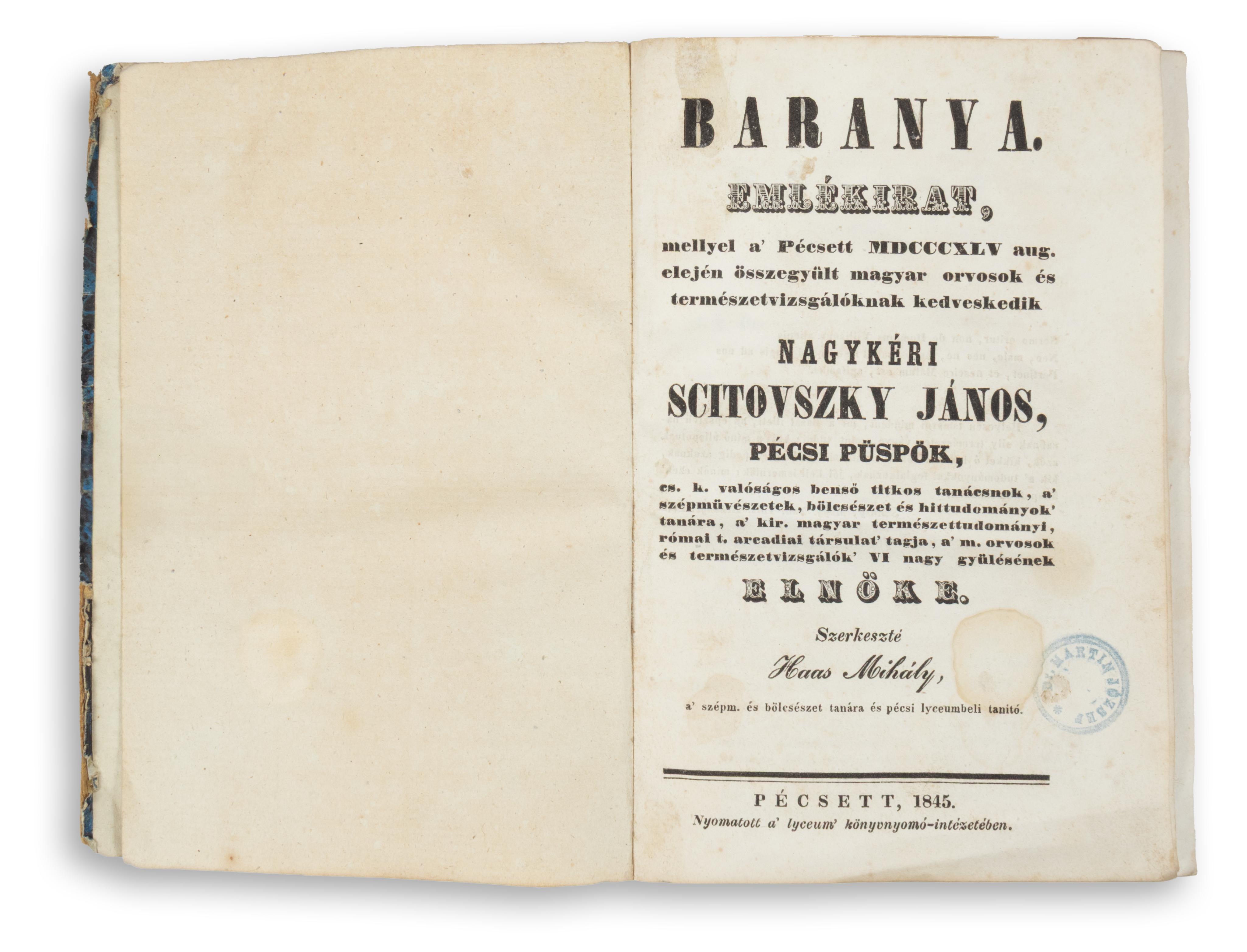 Baranya. Emlékirat, mellyel a Pécsett 1845. aug. elején összegyült magyar orvosok és természetvizsgálóknak kedveskedik Nagykéri Scitovszky János pécsi püspök…