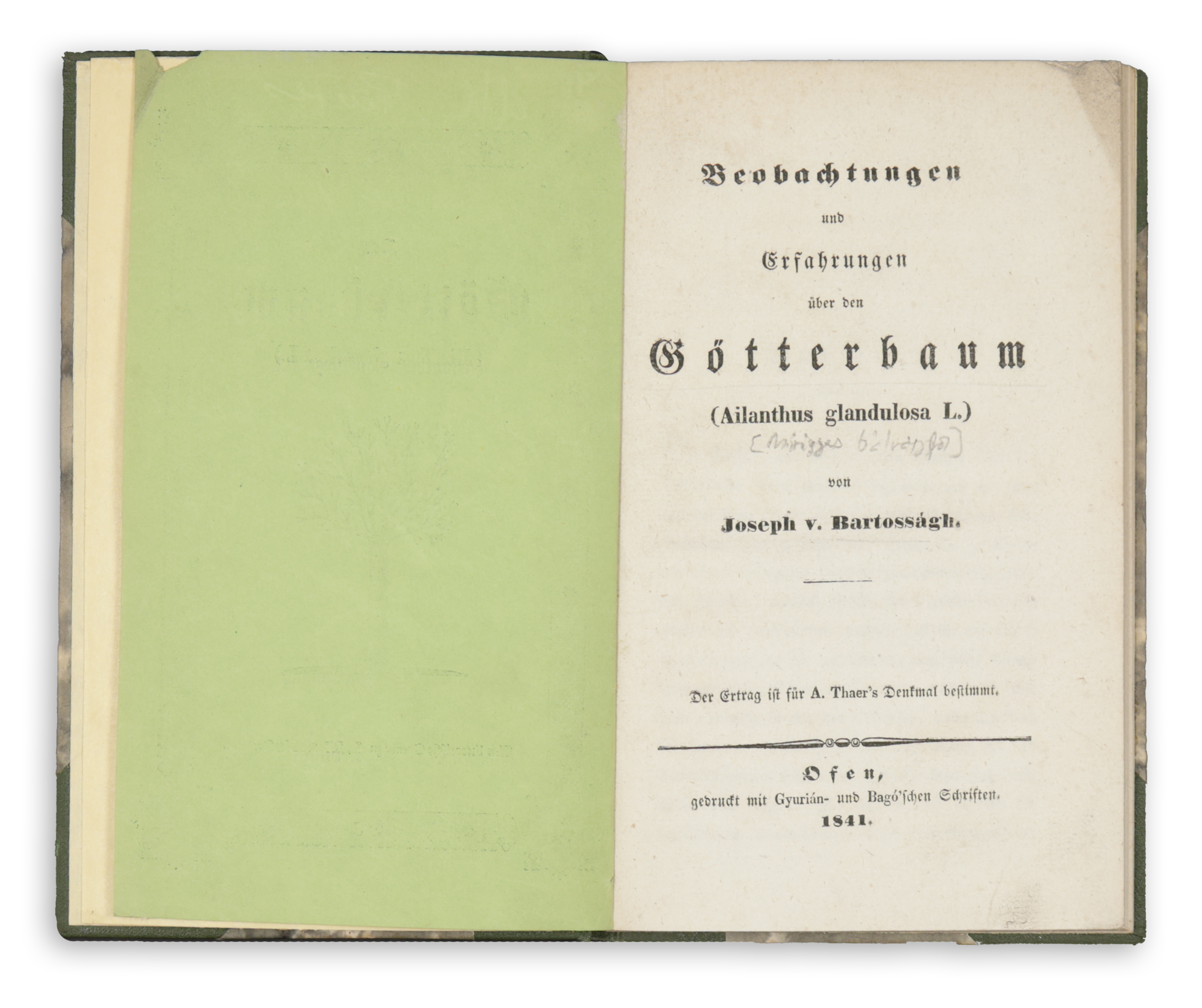 Ofen [Buda], 1841. Gyurián és Bagó.Hazánkban a mirigyes bálványfa (Ailanthus Glandulosa) az " ecetfa" jelenleg az egyik legveszélyesebb fásszárú özönnövény fajunk, és az ellene való védekezés természetvédelmi és gazdasági okokból is szükséges. A mirigyes bálványfa hazája Északkelet-, Közép-Kína és KoreaInnen indult világhódító útjára a XVIII. század közepén, melynek egyes források szerint Párizs mások szerint London.