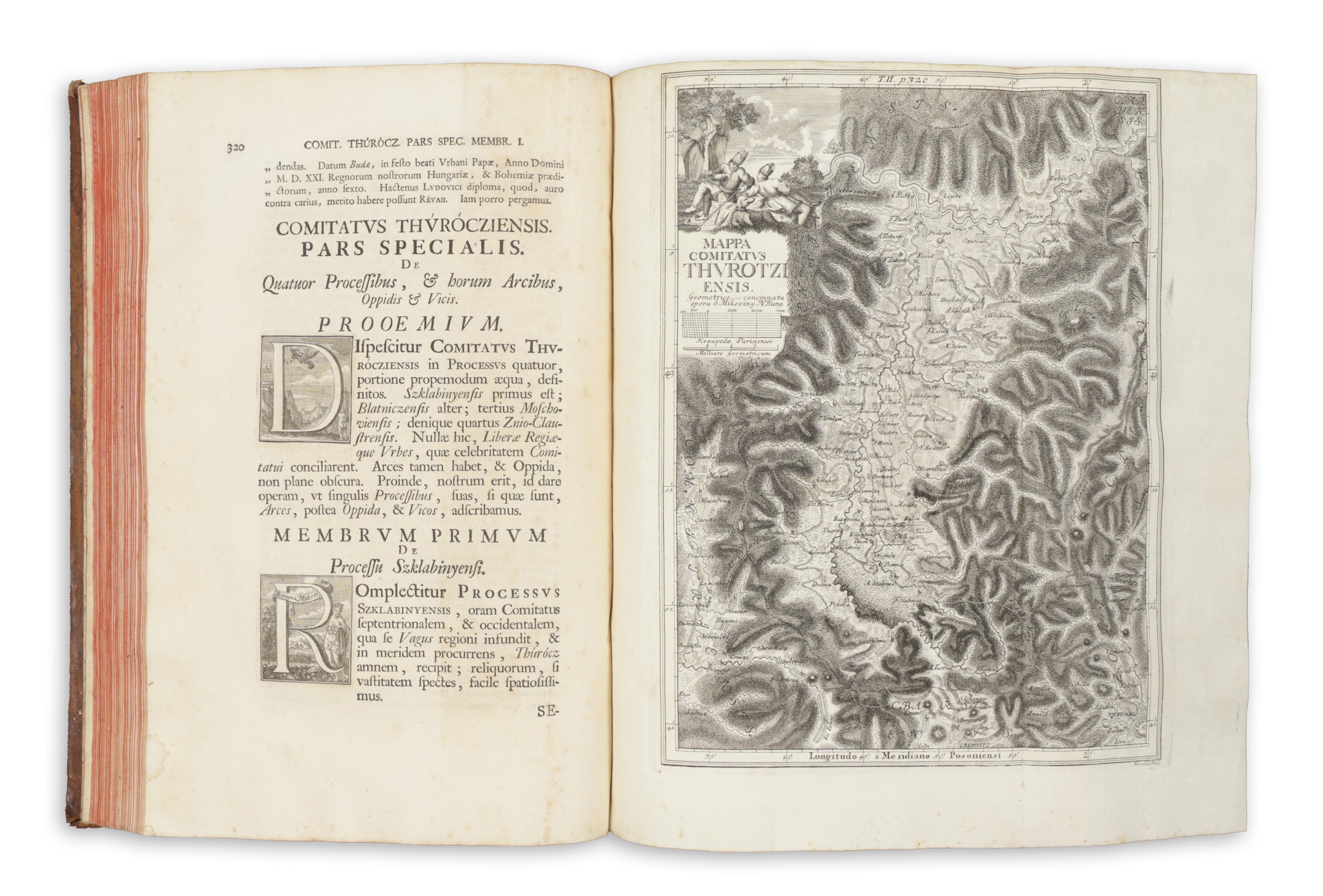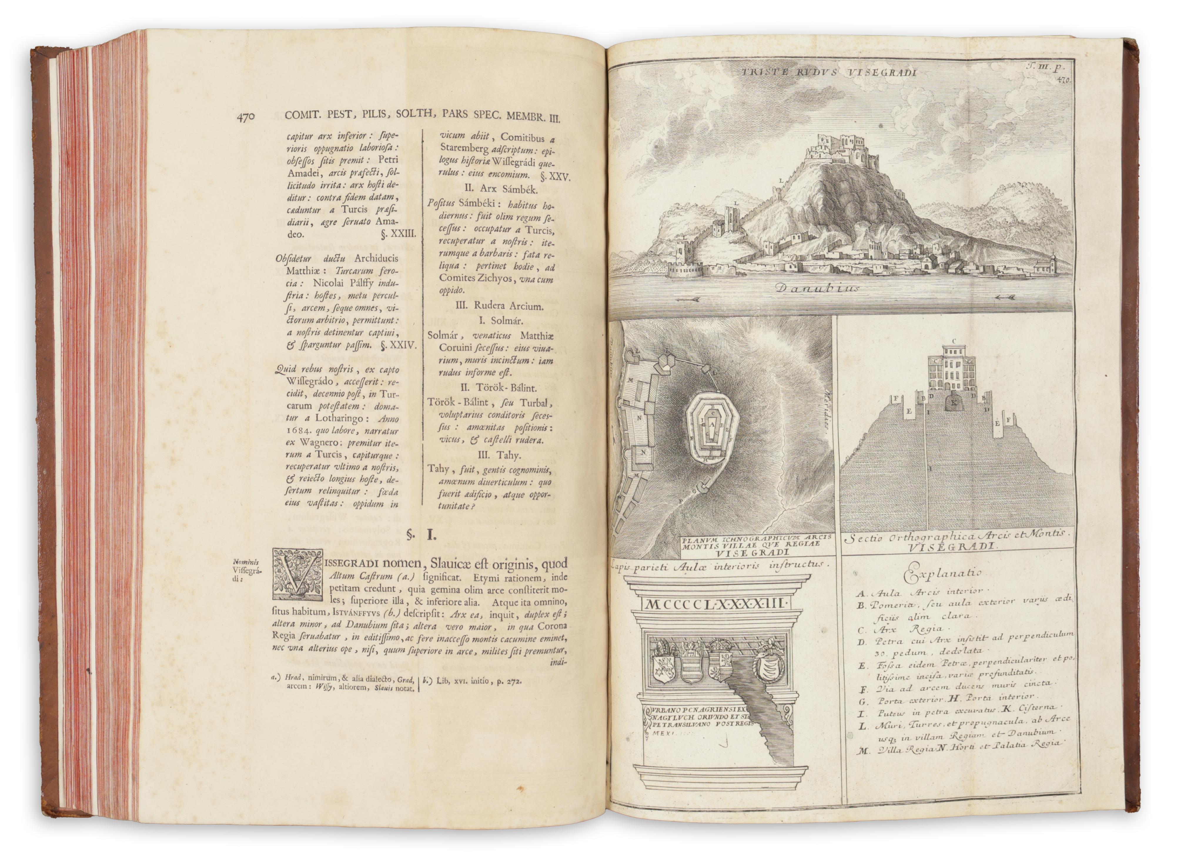 III. 1t. rézm. (allegorikus címkép Corvin Mátyással) + [24, ebből 1 rézm.] + 642 + [2] p. + 3 kihajt rézm. térkép (Solt, Pest, Pilis vármegye) + 1 rézm. t. (Visegrád, többosztatú)