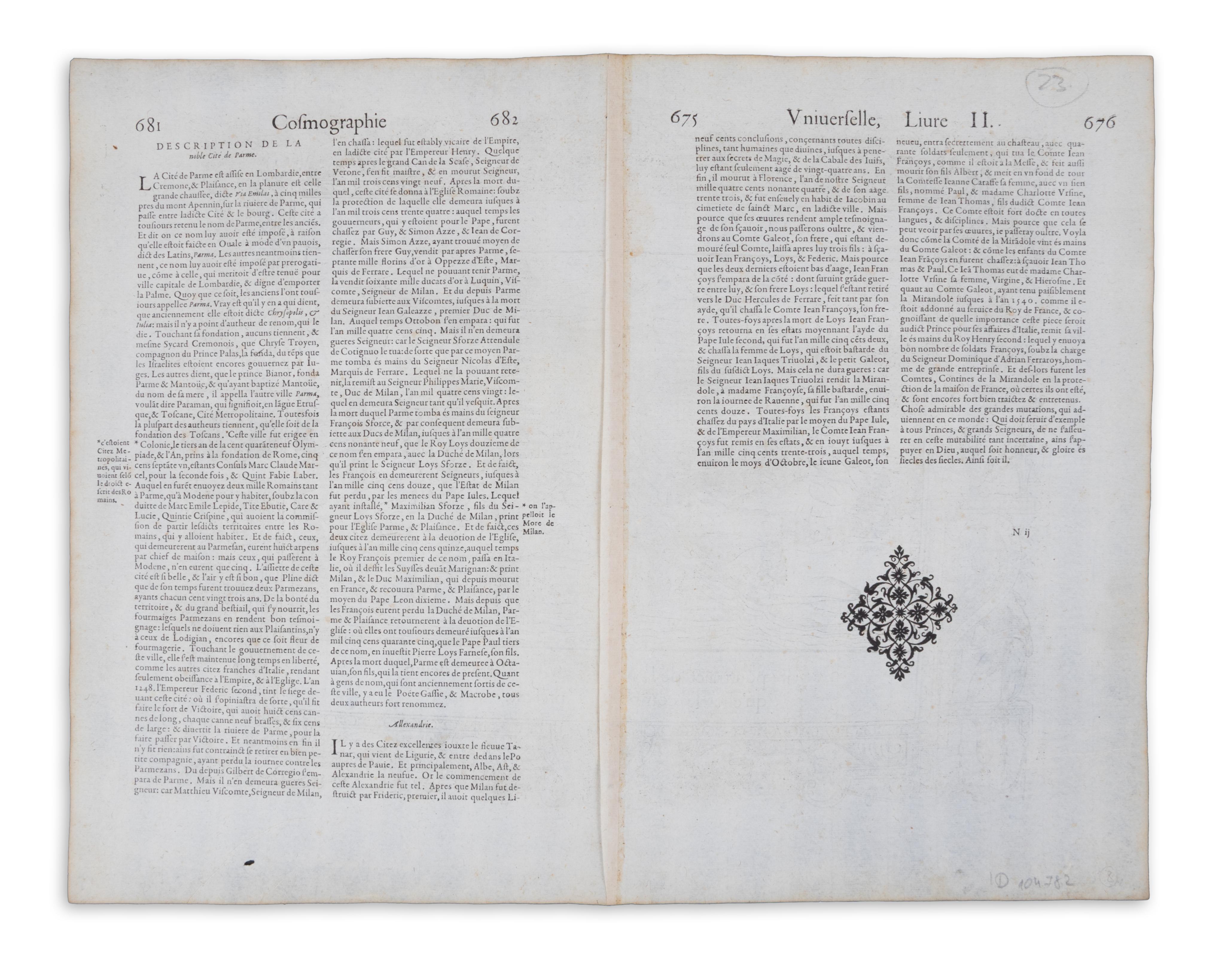 Belleforest's Cosmographie is organized into two parts, with the first part being split into two volumes; thus, each of the three volumes has its own title. Some copies of the publication feature the imprint of Chesneau, while others bear the imprint of Sonnius.