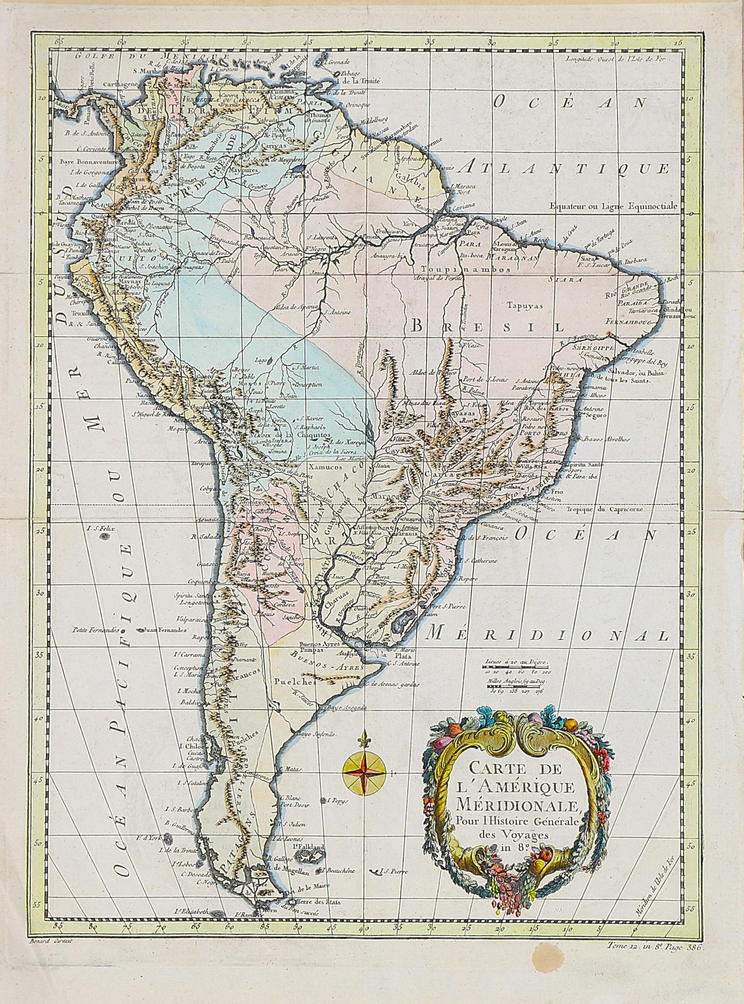 Dél-Amerika kézzel színezett rézmetszetű térképe díszes kartussal, amelyet Franciaország vezető térképésze és a király térképkészítője, J.N. Bellin adott ki.