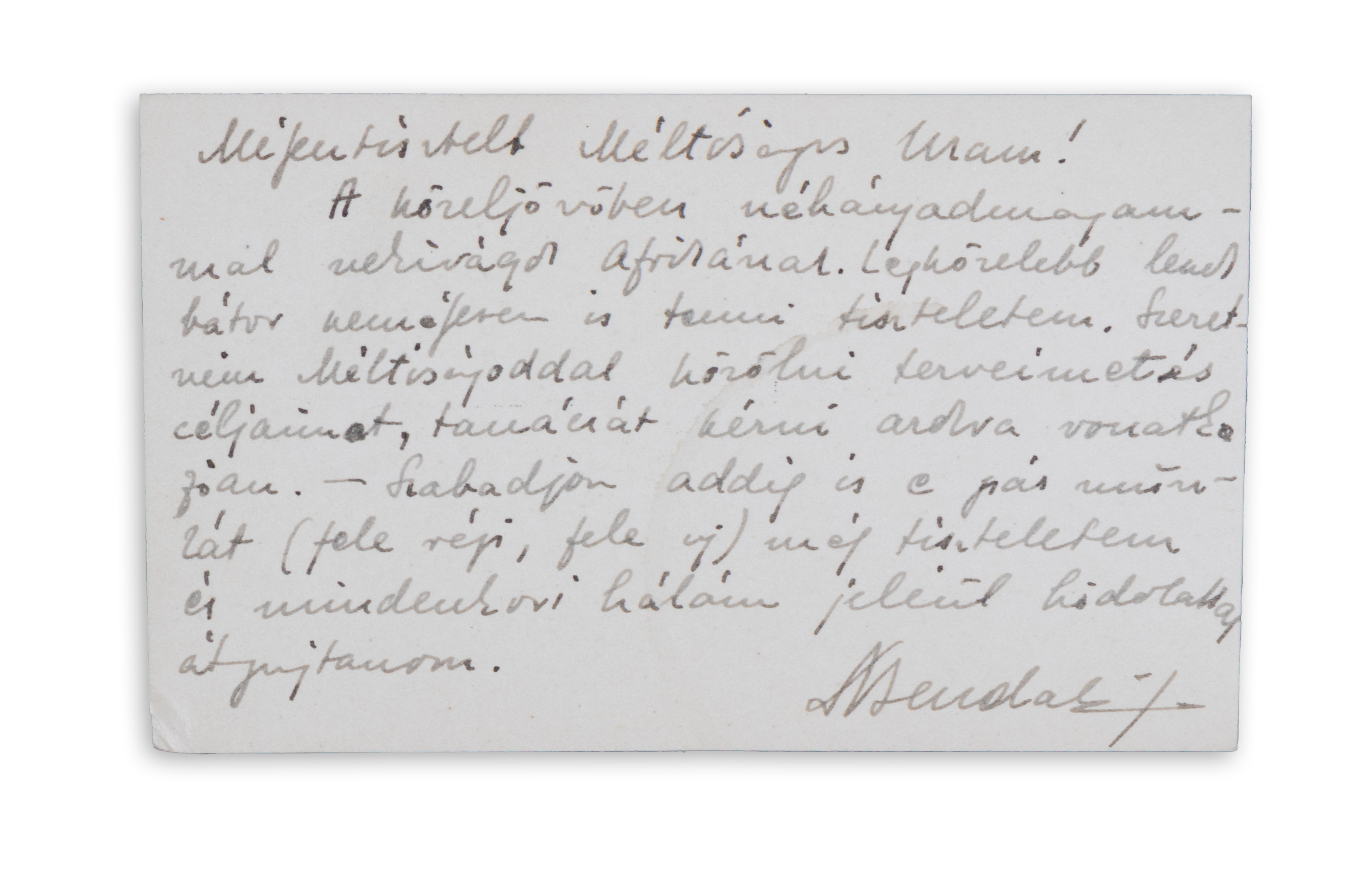 Hozzátartozik Bendeffy névjegykártyája, verzóján 8 soros sk. beírással, dátum nélkül: Mélyen Tisztelt Méltóságos Uram címzéssel, amelyben közli, hogy legközelebb Afrikába utazik, és a fenti öt dedikált munkáját ajánlja nagy hálával a címzettnek, Prinz Gyulának.