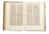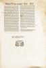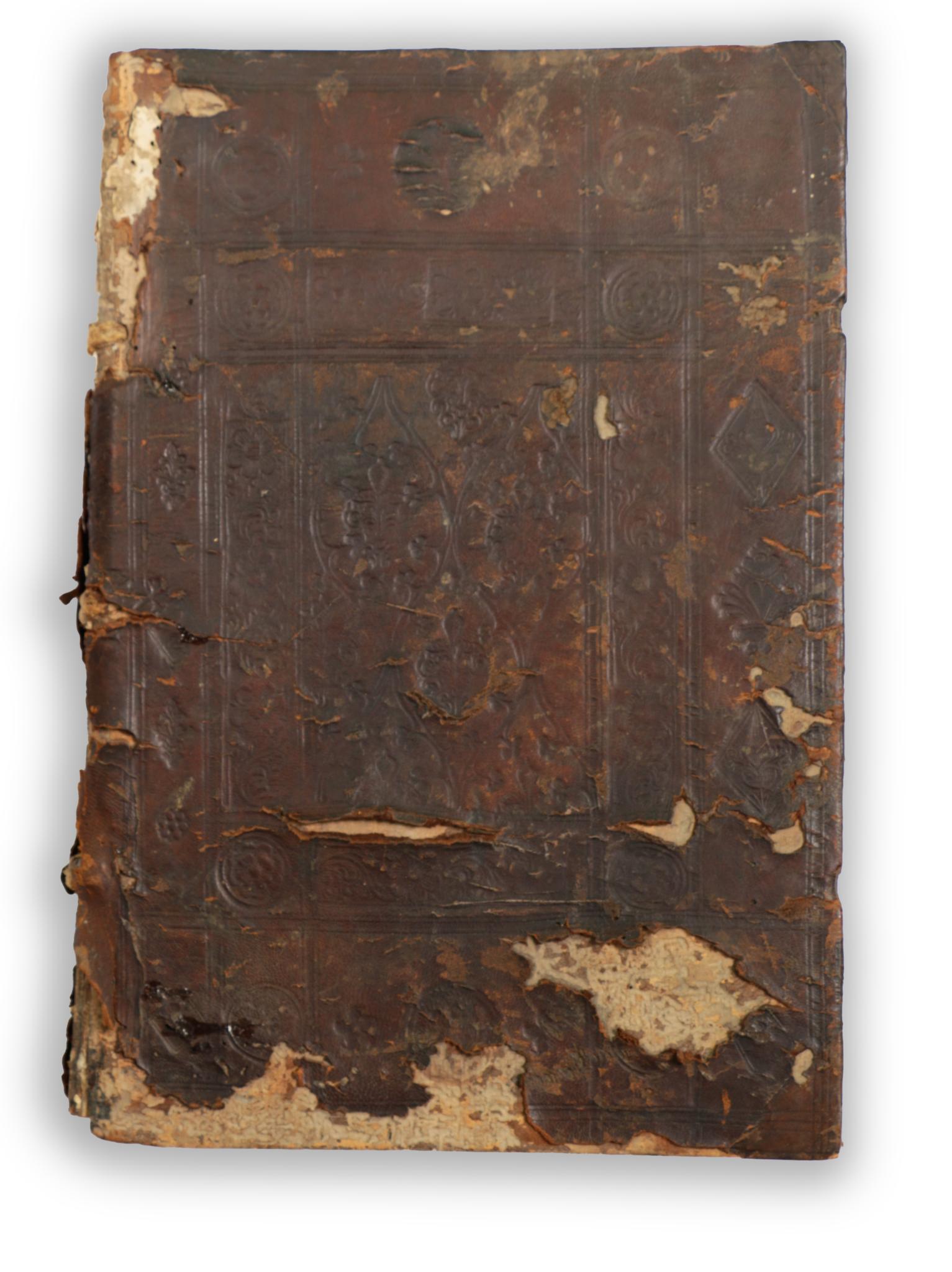 In a full leather binding with three ribs and wooden boards. The boards are decorated with scrolls with blindstamped floral designs and emblems divided into fields. The binding is heavily damaged, lacking in several places, as is the spine. The two slit-folded folding-glasses above have capital chapter titles with initials painted in red. Leaves clean but with soiled and stained page edges all around. Last few leaf corners are missing, text is fine. Two very early inscriptions on title page: Johannes Steinsdorfer, Casparus Reichennauer