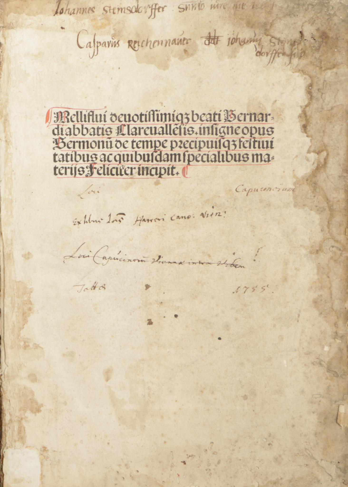 Basileae, 1495. Nicolaum Kesler.Melliflui deuotissimiq[ue] beati Bernardi abbatis Clareualle[n]sis. insigne opus Sermonu[m] de temp[or]e precipuisq[ue] festiuitatibus ac quibusdam specialibus materijs Feliciter incipit