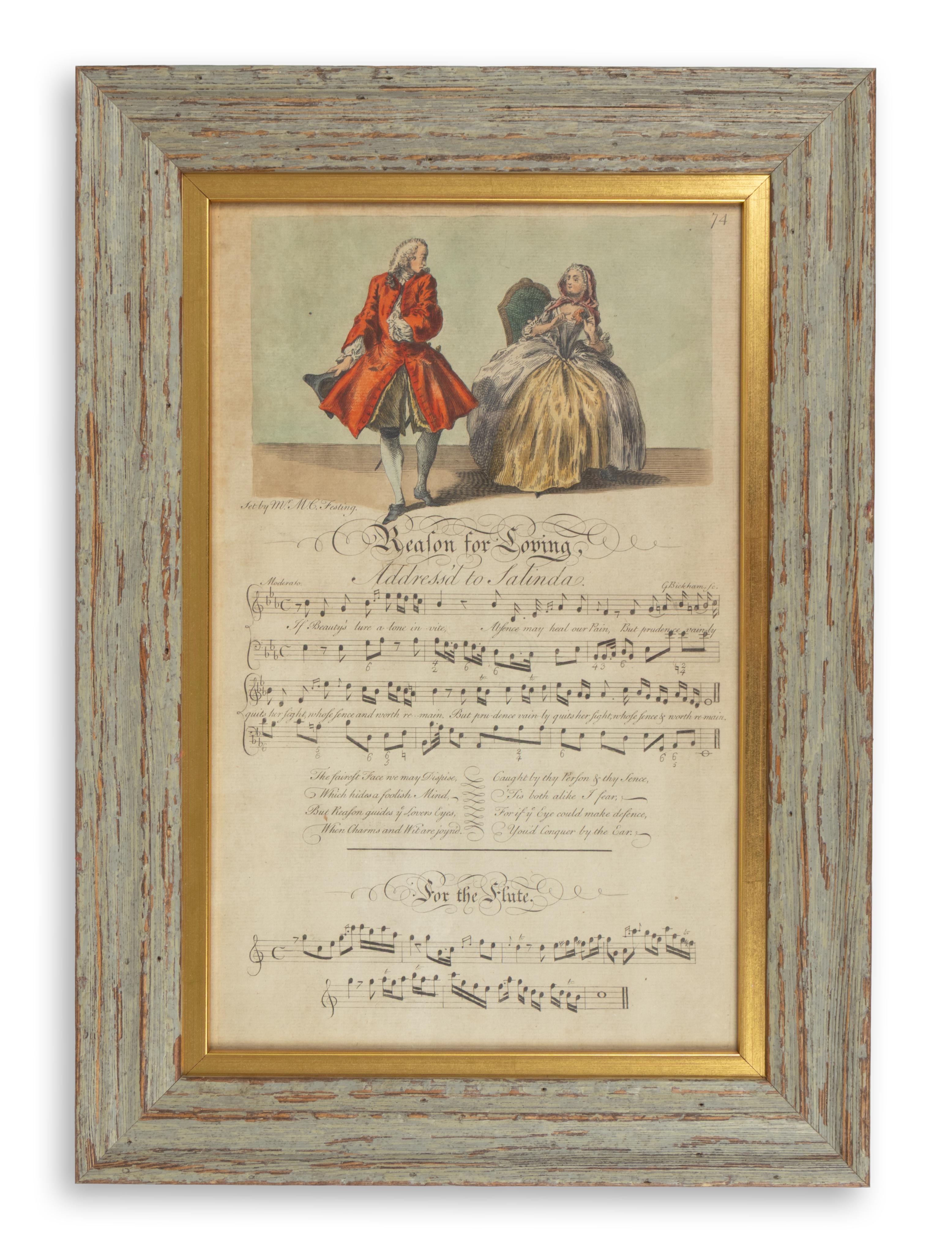 Colored illustrated sheet music. M.C. Festing (Michael Christian Festing) was a prominent 18th-century English violinist and composer, famously collaborating with engraver George Bickham the Younger on The Musical Entertainer, a landmark illustrated music book featuring songs set by Festing with elaborate vignettes by Bickham, making it a key work in English musical publishing.
