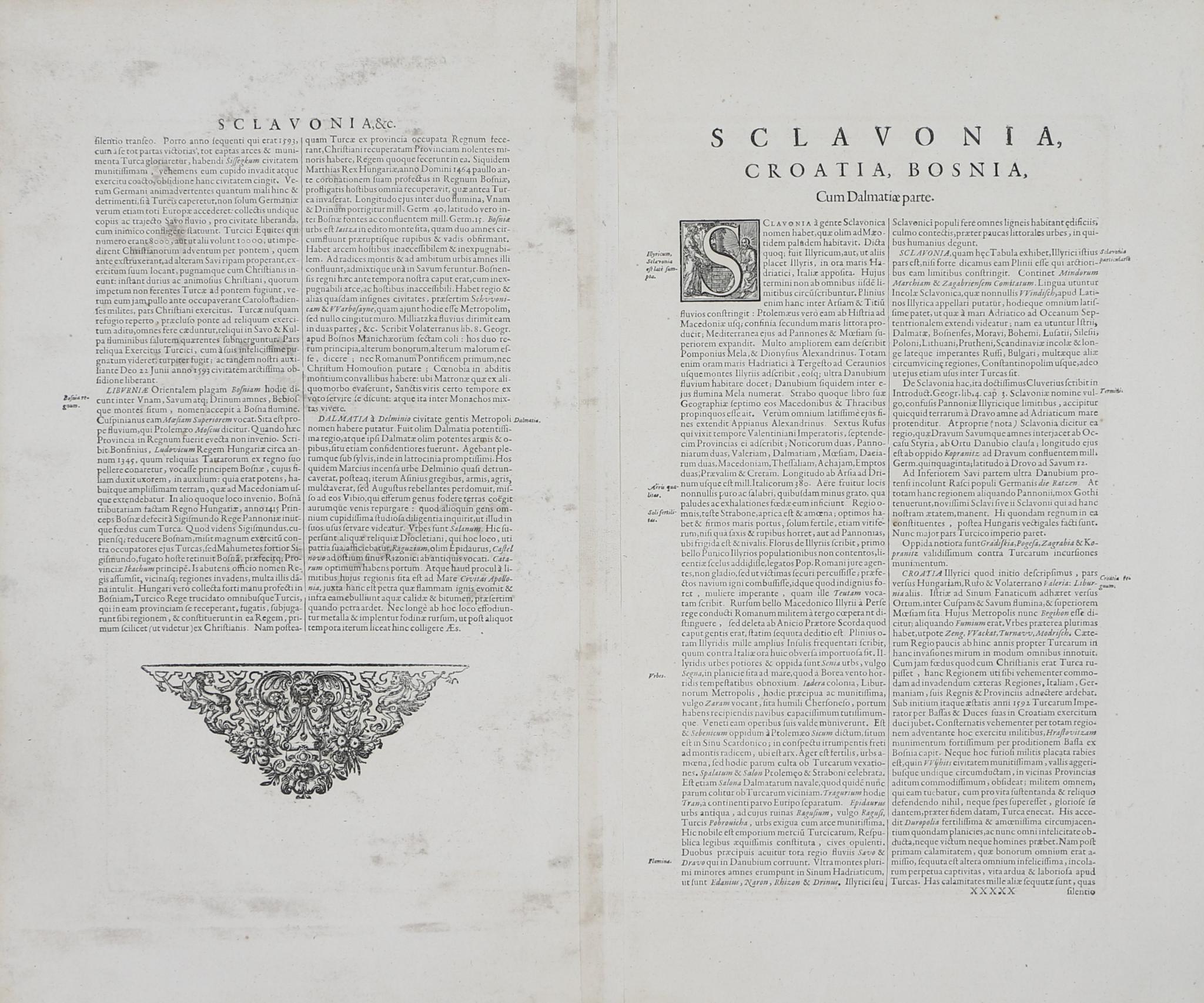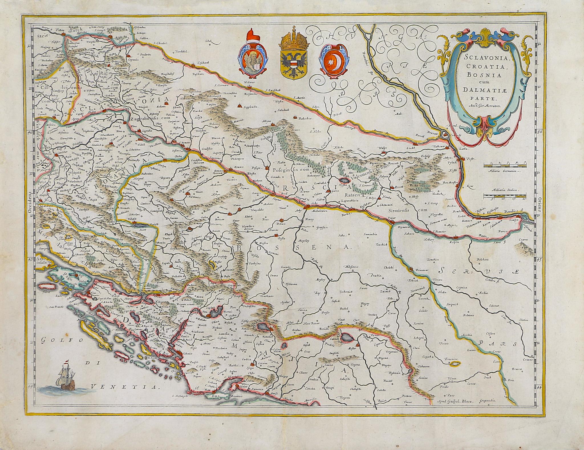 Ez az elegáns, eredeti színezésű térkép Gerard Mercator kartográfiája alapján készült, amint azt a kartuson is olvashatjuk. Mercator eredeti, 1595-ös térképét (amely Mercator Atlas Sive Cosmographia című atlaszában jelent meg) a későbbi térképészek, köztük Hondius és Blaeu a 17. század elején kibővítették és újraértelmezték. A térkép a Balkán kelet-európai régióját ábrázolja, amely magában foglalja Szlavóniát, Horvátországot, Boszniát, a Velencei-öblöt balra lent, valamint Szerbia nyugati felét, a Dráva folyó északi partjától a Drina folyó déli szakaszáig, illetve a nyugati Ptujtól a keleti Belgrádig. A térképen a régiók, hegyek, folyók és városok feliratai szerepelnek, középen felül három címer látható. A verson latin magyarázó szöveg.