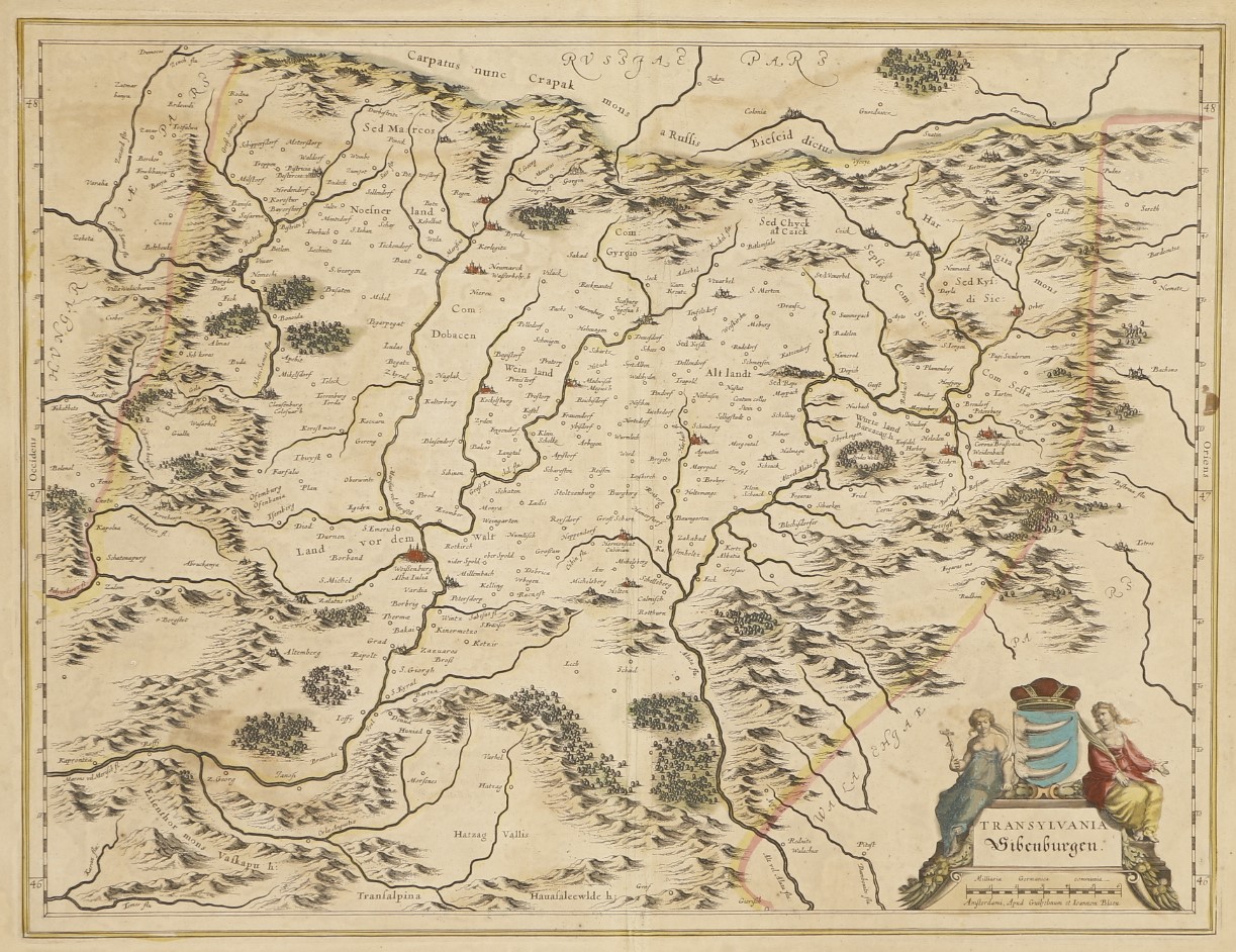 Copy of Mercator's map of Transylvania of 1595-1602, with Latin text on the verso, contemporary border colouring, coloured cartouche. Between the allegorical female figures seated above the cartouche, Transylvania and the Báthory family with the coloured coat of arms of the dragon tooth.