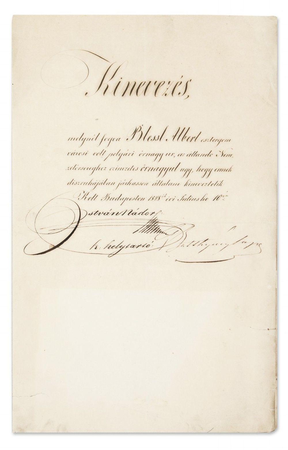Letter of appointment of Albert Bleszl (1777-1860) signed by Archduke Stephen of Austria (Palatine of Hungary) and Hungarian statesman Lajos Battyhány. Paper, restored.