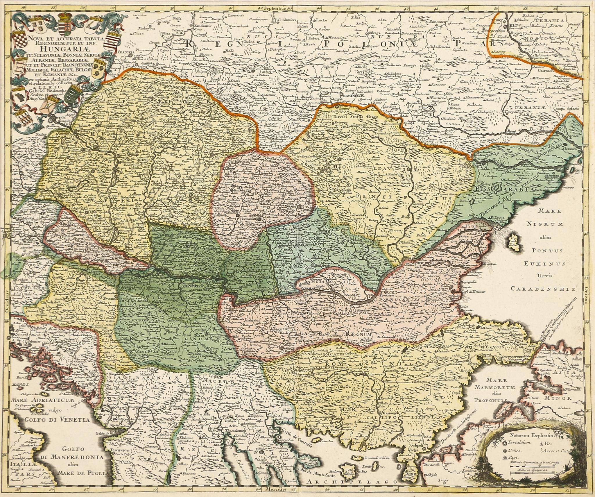 Bodenehr ritka, kézzel színezett, nagyméretű rézmetszetű térképe, rajta Magyarország és a Balkán, a Dunával Bécstől a Fekete-tengerig. Önálló lapként jelent meg 1730 körül.