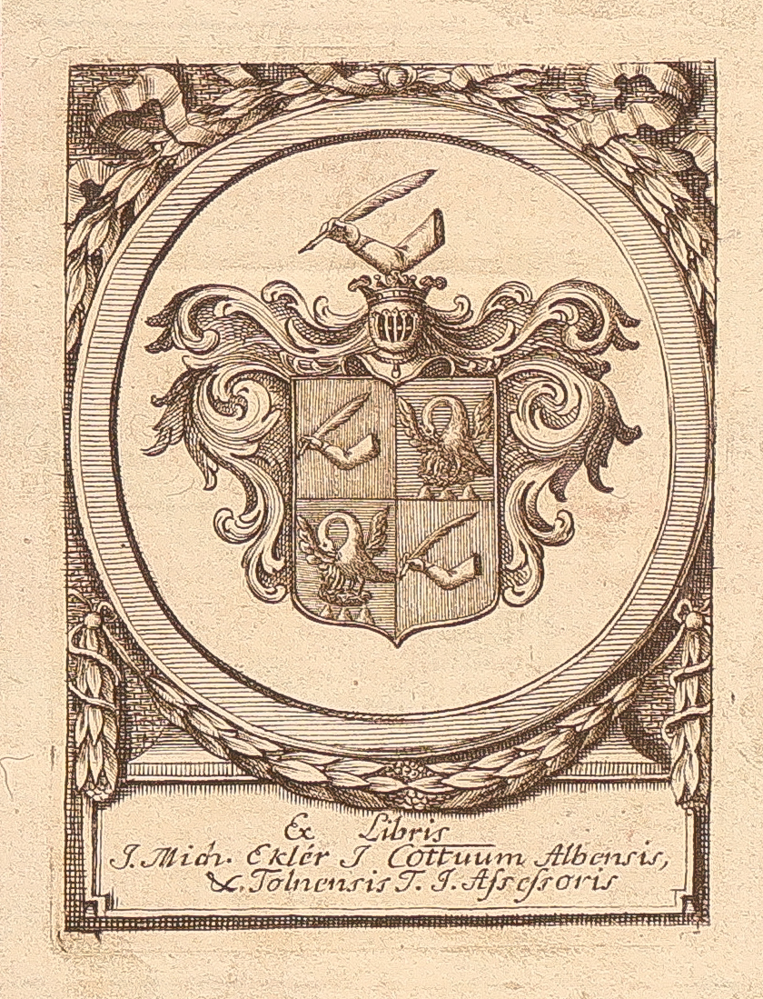 Beragasztott címeres ex librissel:  "Ex Libris J. Mich. Eklér J Cottuum Albensis, & Tolnensis T. J. Assessoris." Eklér János Mihály (bicskei szolgabíró) 1790-ben nyert címereslevelet.