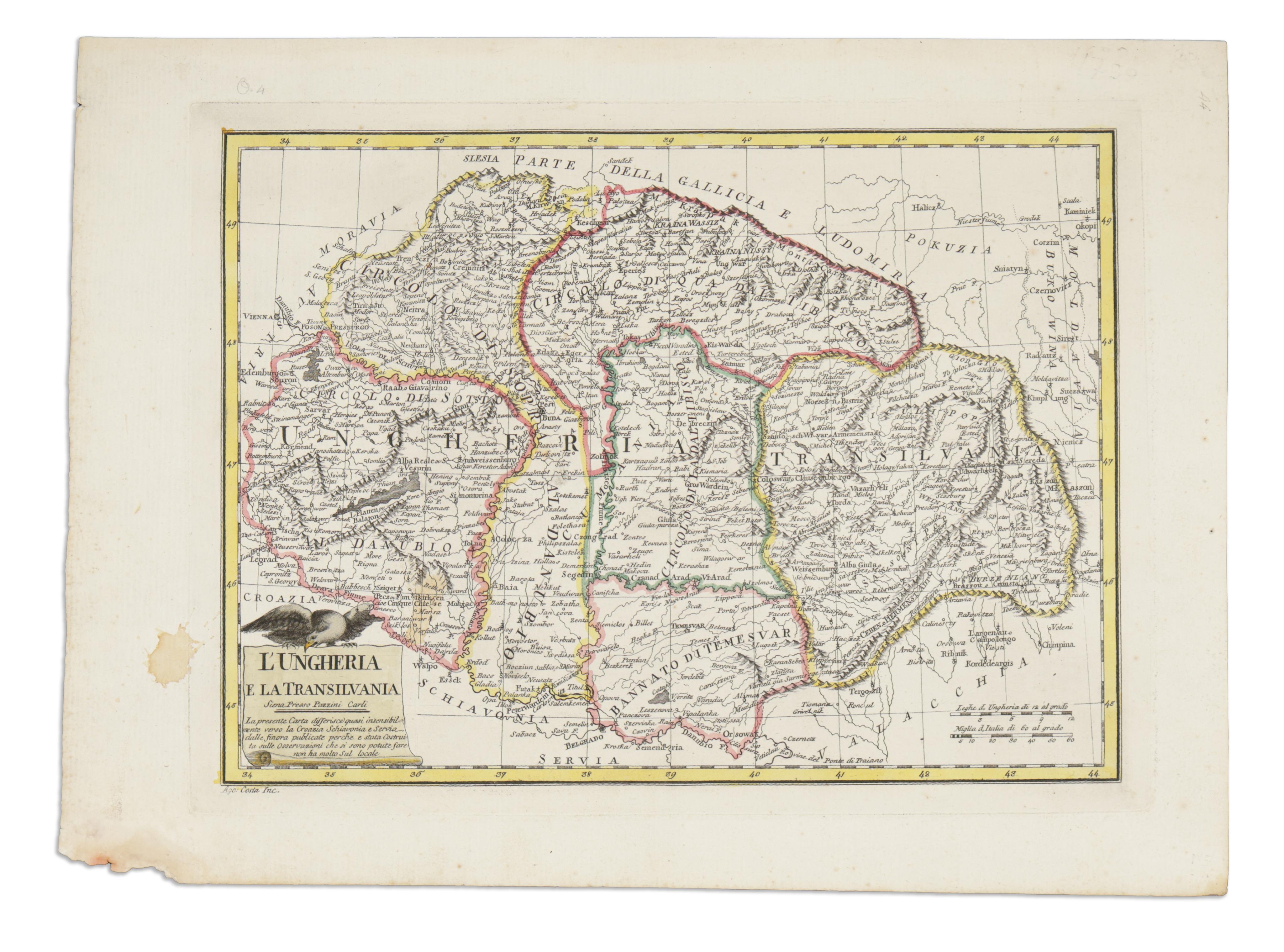 Copper engraved map of Hungary, with border colouring. Bartolomeo Borghi's map was published in the "Atlante Geographico" in Siena in 1790.
