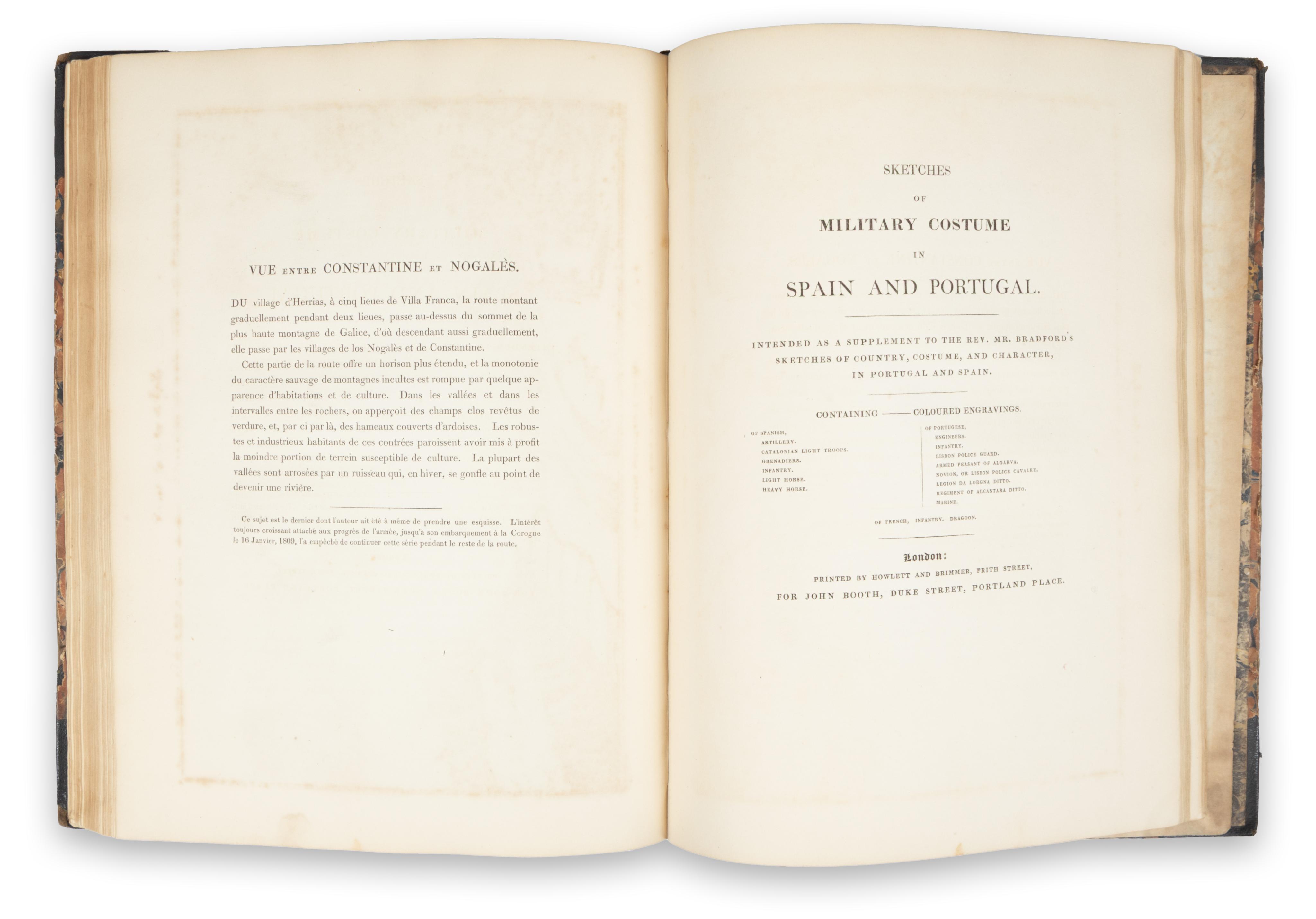 Bound with: Sketches of Military Costume in Spain and Portugal. Intended as a Supplement to Rev. Mr. Bradford's Sketches of Country, Costume, and Character, in Portugal and Spain. London, 1810. Printed for John Booth by William Savage. 10p. + 13 t. + 24 p.