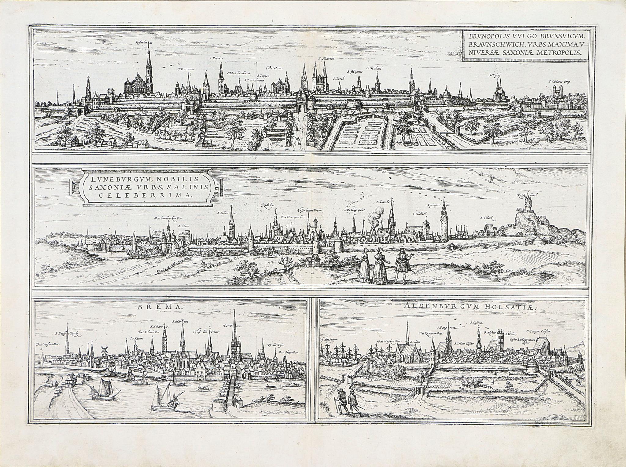 1572 Cologne [Köln]Braunschweig, Lüneburg, Bréma és Stade látképe, a verson a városok latin nyelvű leírásával.