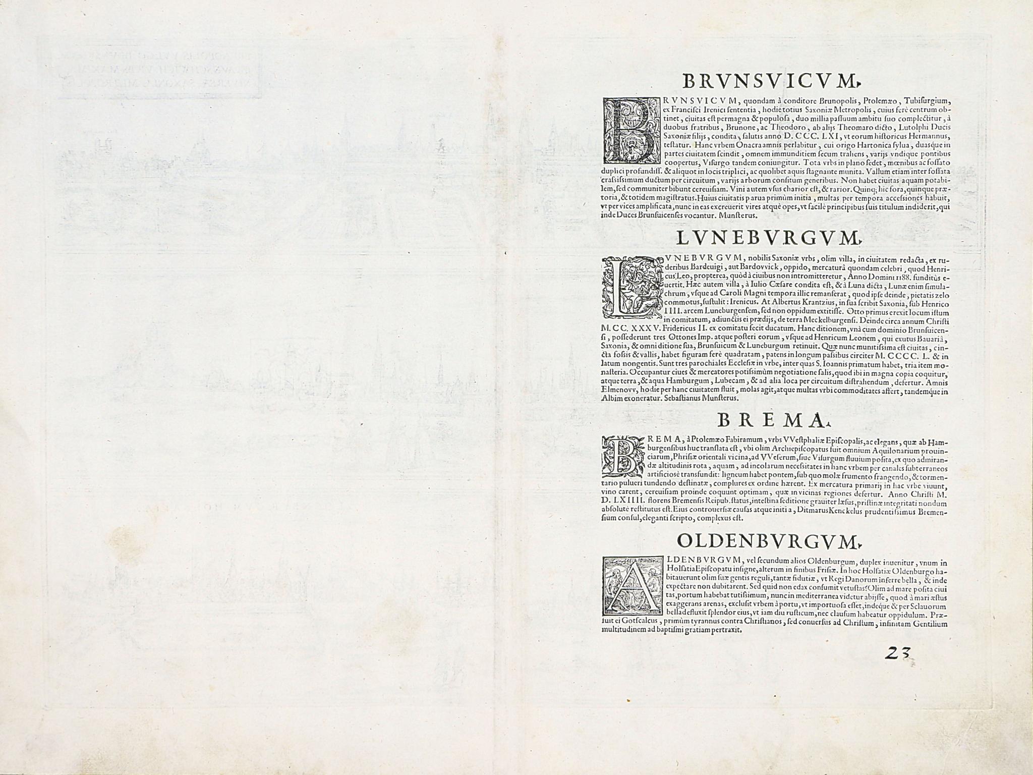 Brunopolis vulgo Brunsvicum, ... Luneburgum, Nobilis Saxoniae Urbs, ...Brema; Aldenburgum Holsatiae.