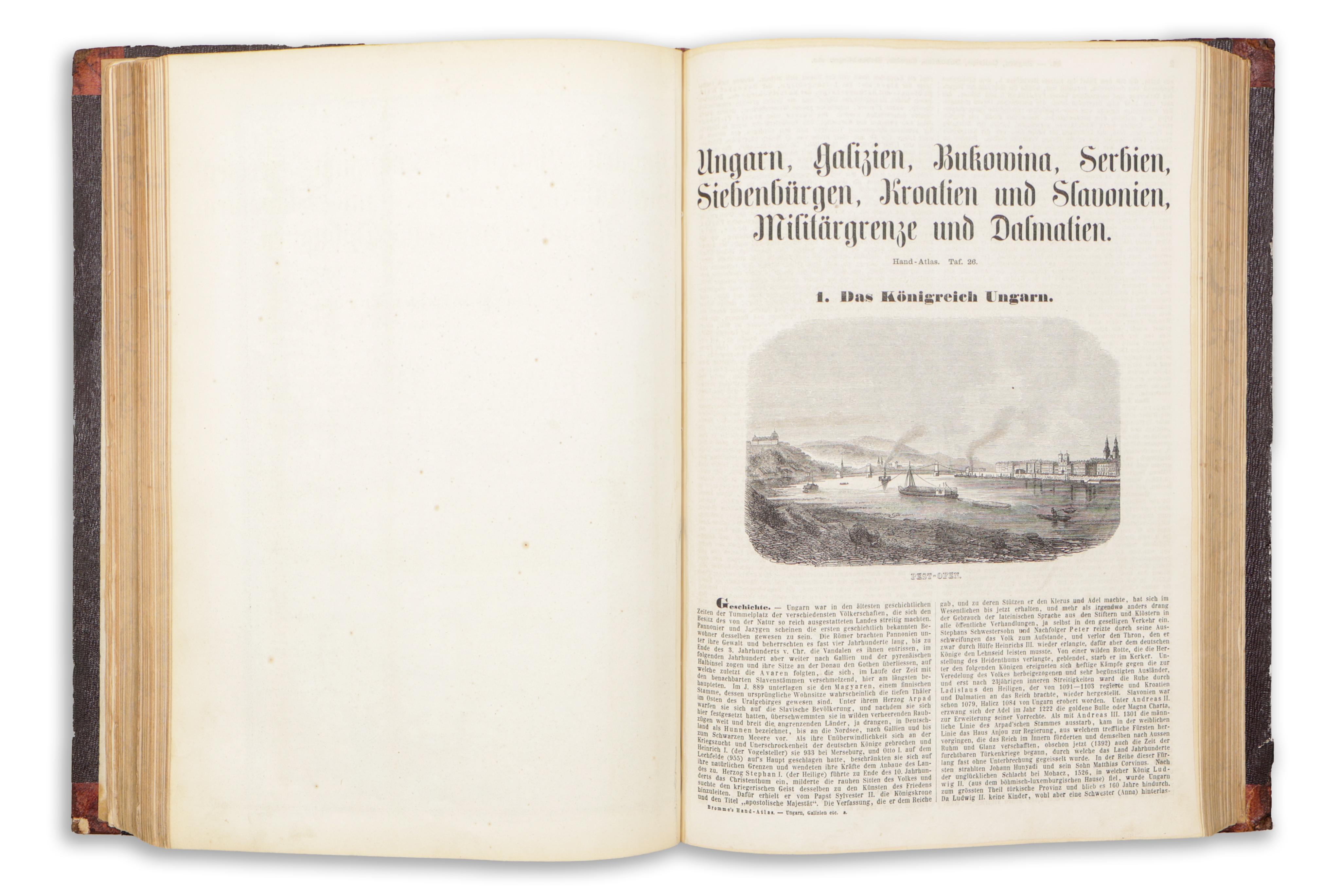 Not just an atlas, but an illustrated, comprehensive geographical handbook with country descriptions, including depictions of key sights and noteworthy information, along with coats of arms and national flags. The descriptions of the individual countries are richly illustrated with numerous woodcut images. The pages vary in foxing (some barely, others more), but are mostly clean overall.