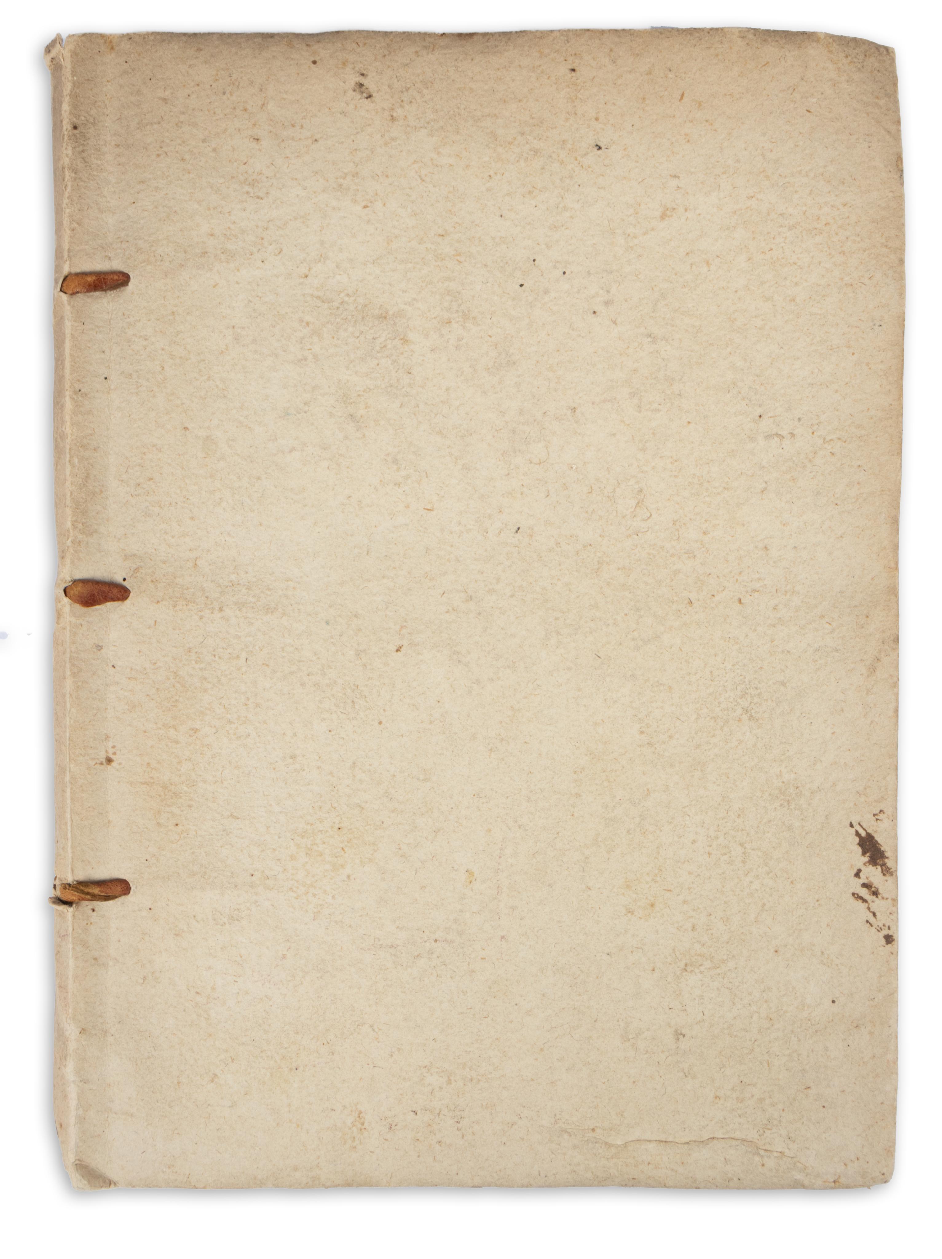 Korabeli papírkötésben, a gerincen átfűzött három bőrszíjjal, körülvágatlan levelekkel. Tábláján piros tintával írt korabeli évszám.